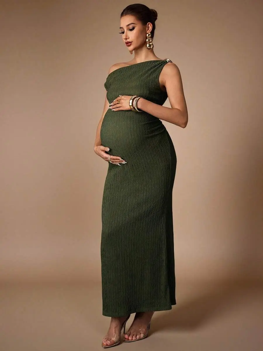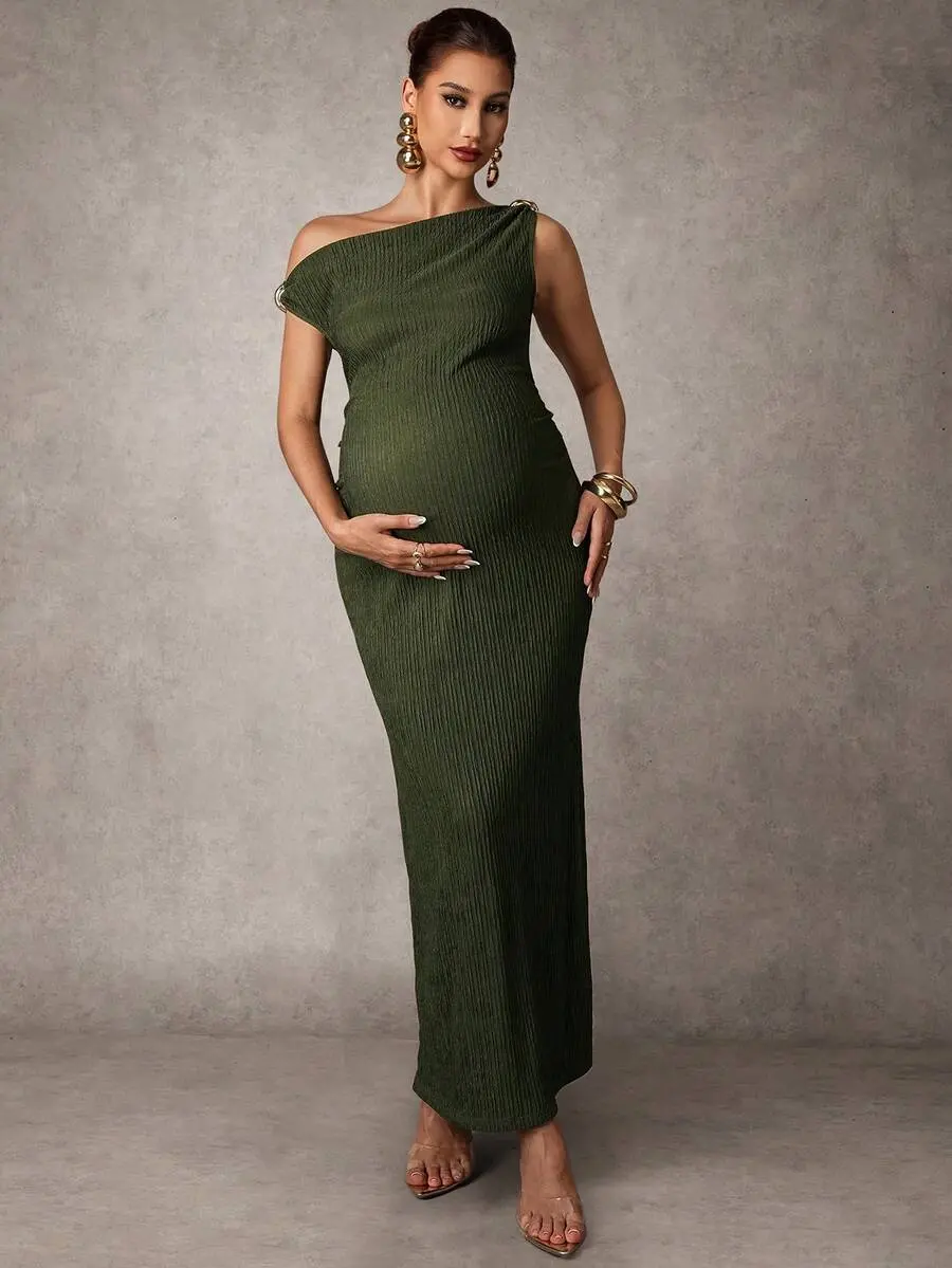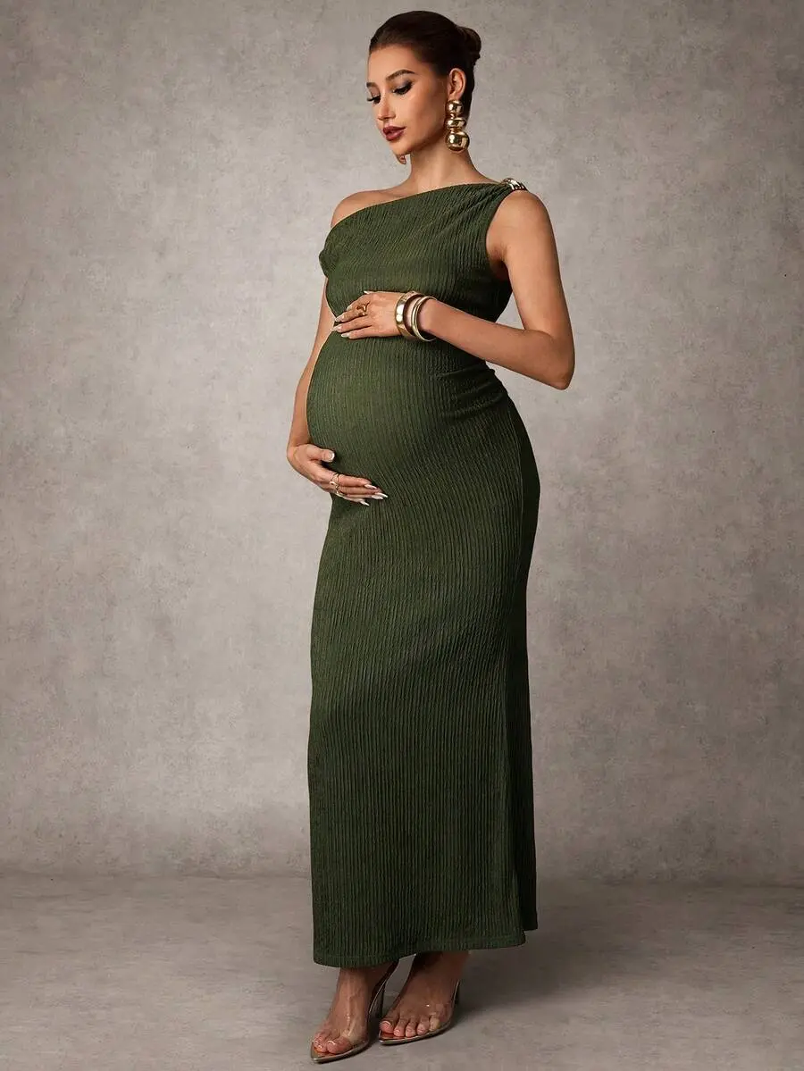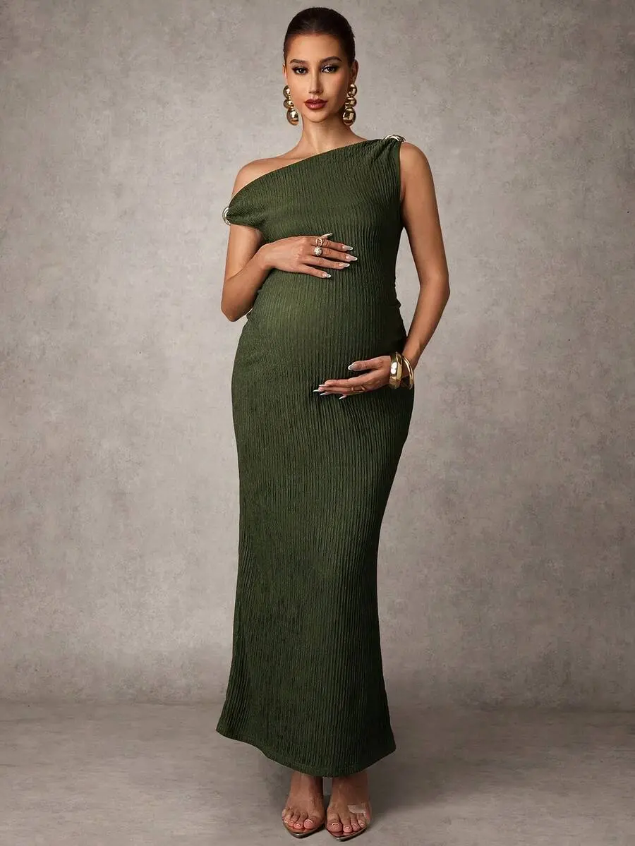 ALLITA Maternity Casual Oblique Shoulder Sleeveless Long Dress Elegant Baby Shower Pregnancy Photoshoot Dress Green