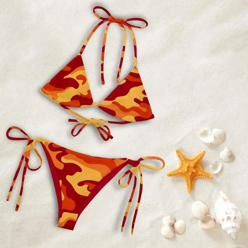 Simple and elegant, our unique custom bikini swimsuit includes 2 pieces – a string tie bikini bottom and a string bikini.