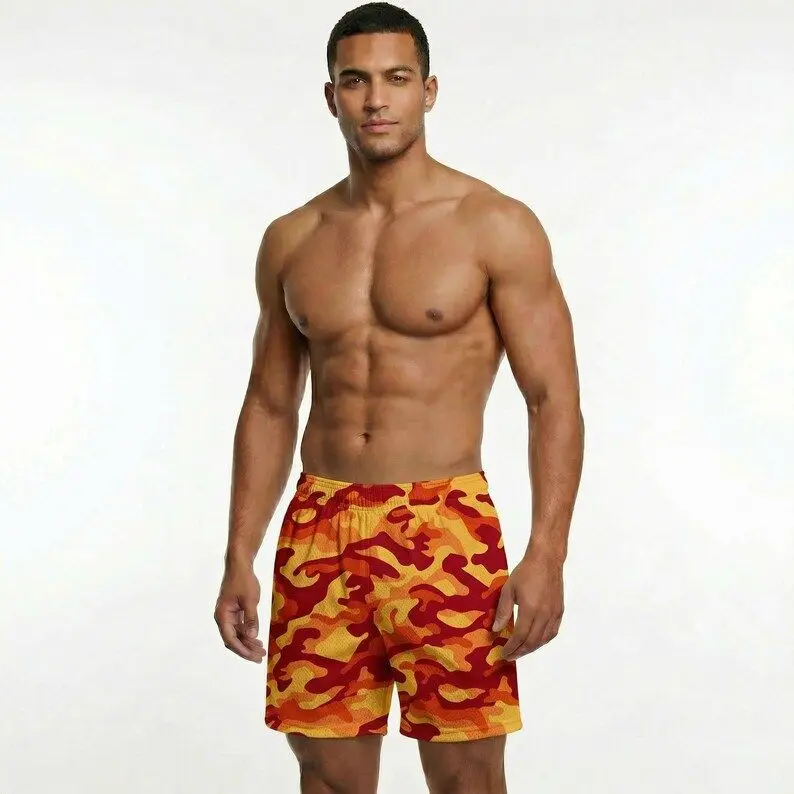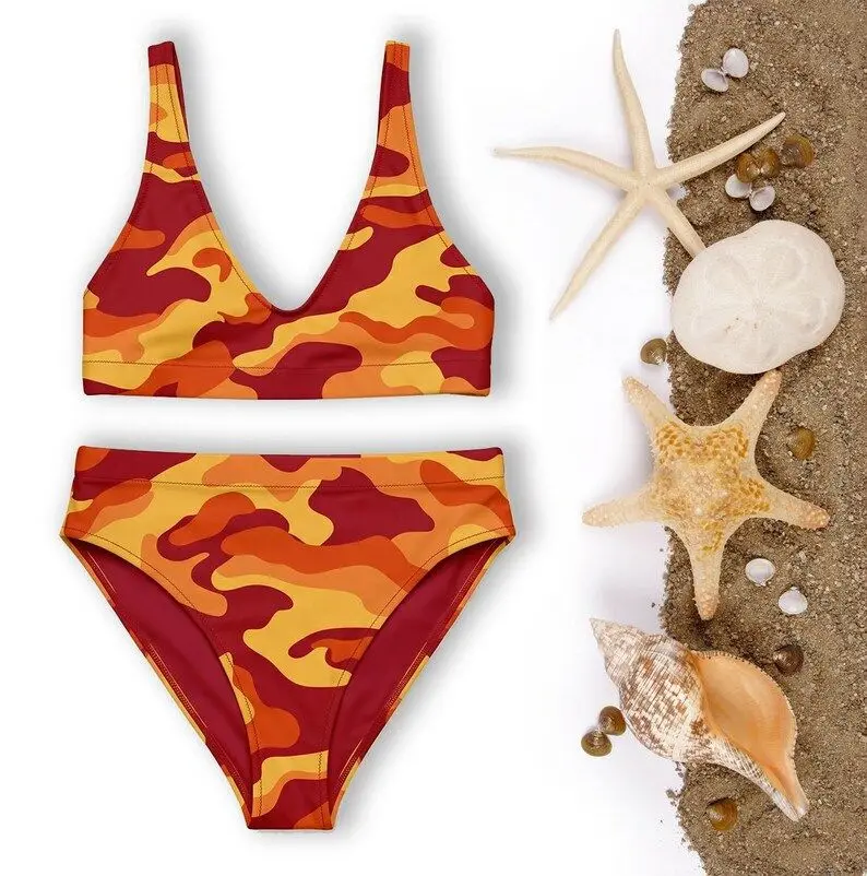 Matching Camo Swimwear Set, Red Orange Bikini, Men's Board Shorts, Couple Vacation Outfit Matching Couple Swimwear Set