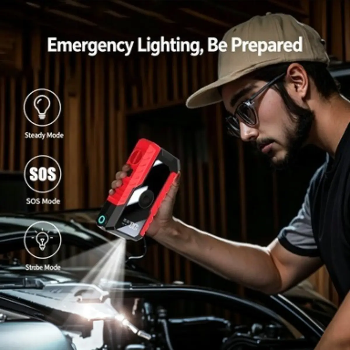🚗 All-in-1 Emergency Lifesaver for 12V VehiclesTired of being stranded by a dead battery or flat tire? Our 12V portable jump starter with air compressor is your ultimate roadside companion! Combining 4 essential functions in one compact device, it’s designed to save you from unexpected car troubles anytime, anywhere.