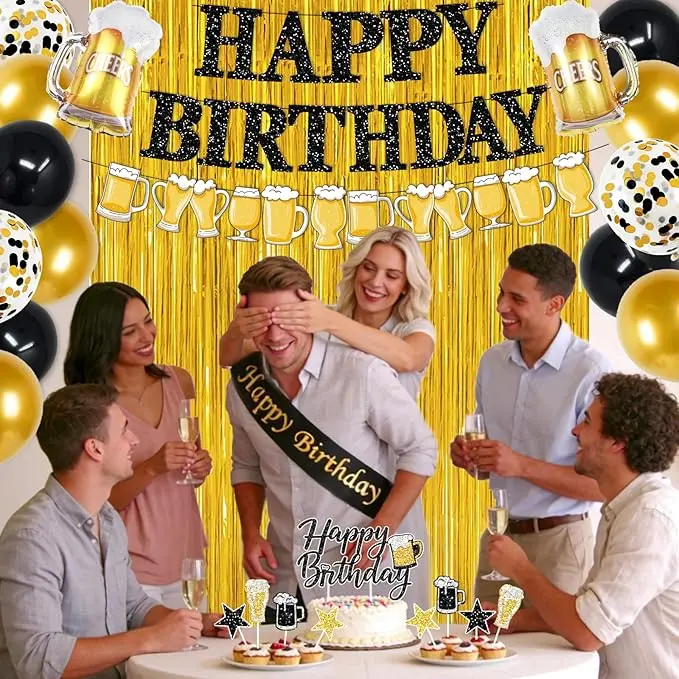 ·All-In-One Beer Theme Party Balloons Kit: This complete set of black and gold birthday decorations includes 1pcs glitter "HAPPY BIRTHDAY" banner, 1pcs unique beers garland, 1pcs elegant sash, 1pcs foil fringe curtain, 4pcs beer foil balloons, 25pcs latex balloons, and 9pcs glitter cake toppers. Packed with everything needed, these black and gold party decorations make setup effortless and stress-free.