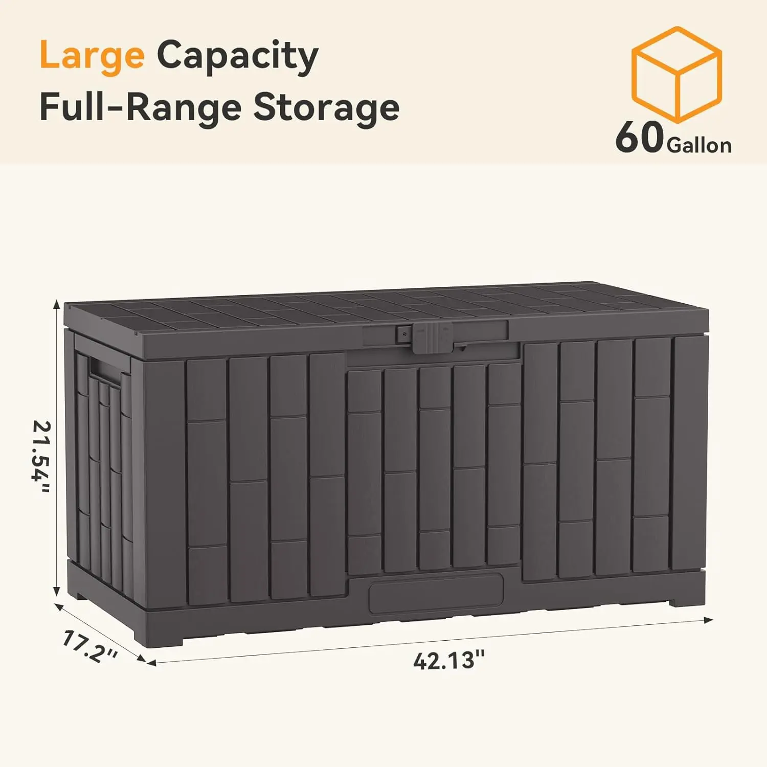 60 Gallon Deck Box, Waterproof Outdoor Storage Box with Lockable Lid, Patio Furniture Bench & Side Table, Outside Storage Container, Tool-Free Assembly, for Garden, Pool, Brown