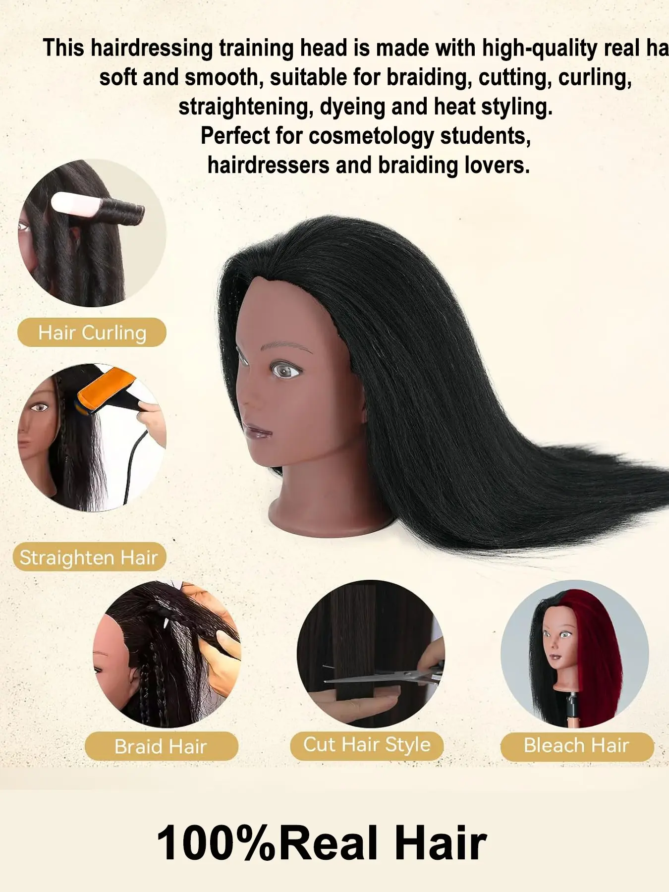【Realistic Hair】: Made from 100% real hair, providing a authentic feel for hairdresser practice and styling.