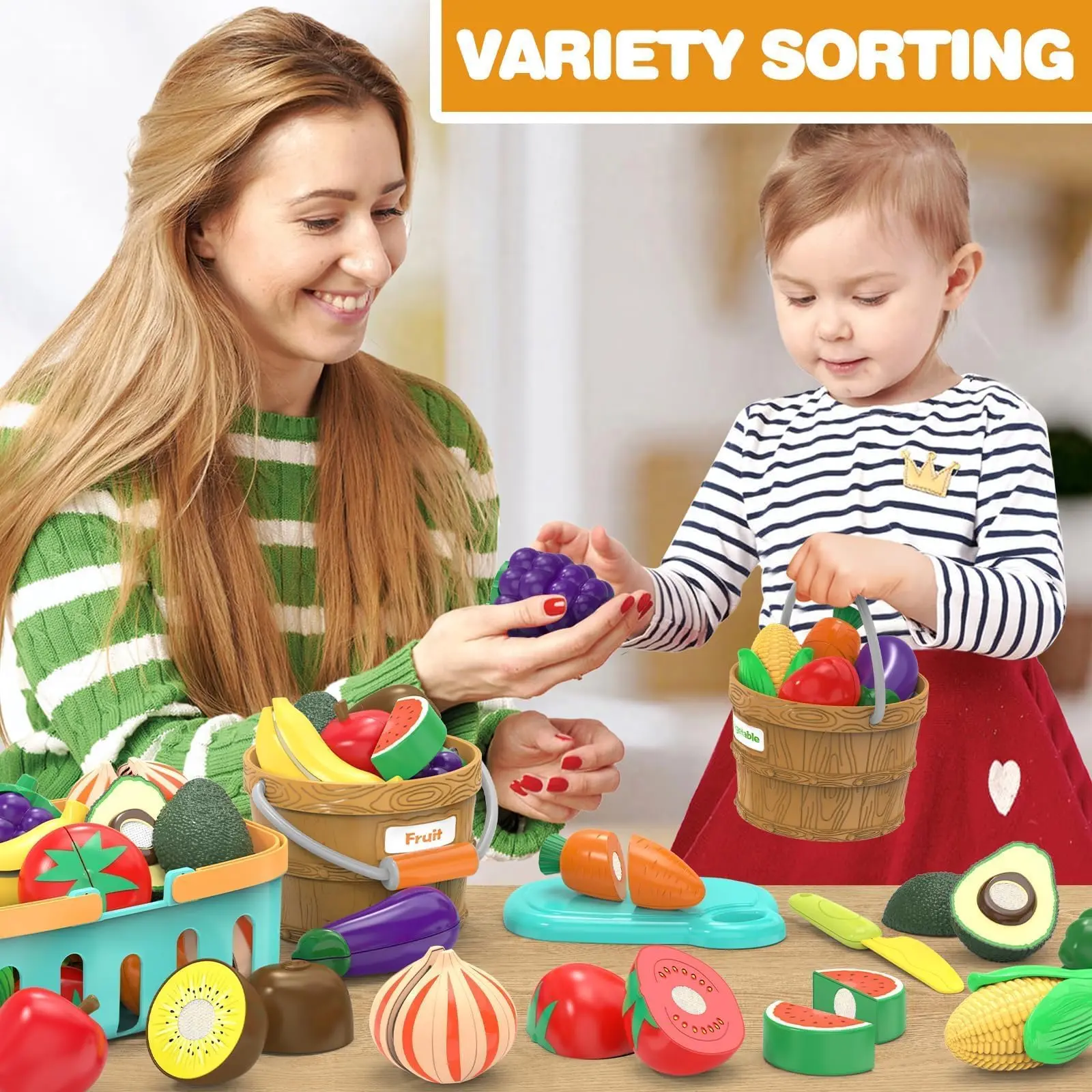 The 2 buckets with handles and recognition labels help children develop storage habits. Sort and learn about kitchen food, fruits, and vegetables. Improve hand-eye coordination and counting skills. Ideal for birthday, Christmas, and other occasions.