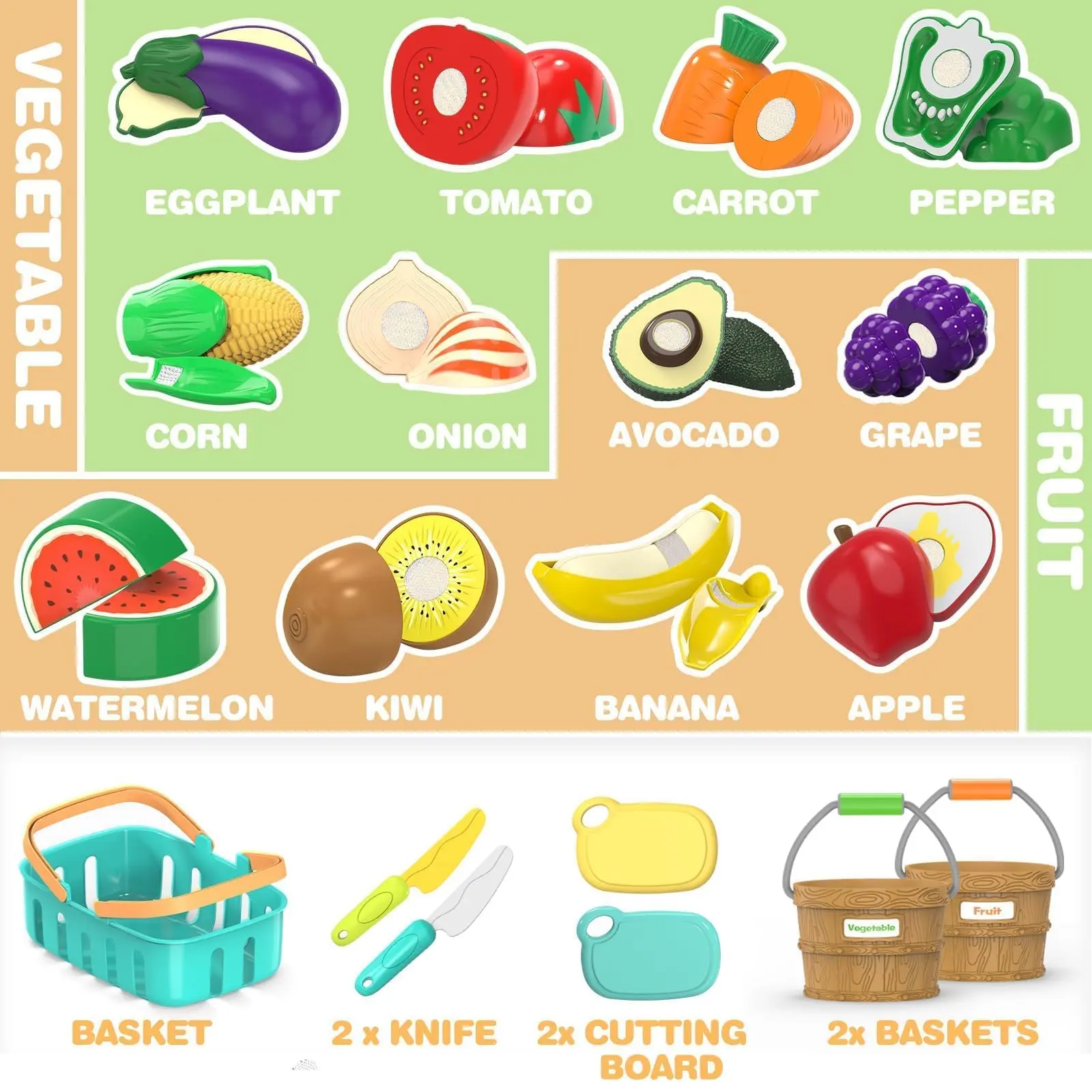 ✨ 29-Piece Set: Includes 12 fruits and vegetables, 2 buckets with handles, 1 basket, 2 toy knives, and 2 cutting boards. Realistic colors and varieties offer a real-life cutting experience. Kids can enjoy "cutting" sounds and store activities. Easy to reconnect and play again, enhancing pretend food magic.