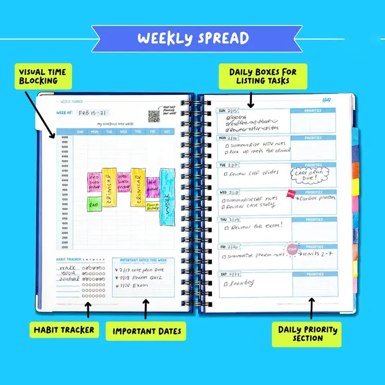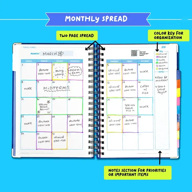 Designed specifically for busy nursing students, this undated 12-month planner helps you stay on top of your hectic schedule — from lectures and clinicals to exams and assignments — without feeling overwhelmed.
