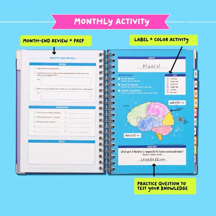·Monthly Review Pages – Reflect on what went well, track assignments, and plan ahead for the next month.