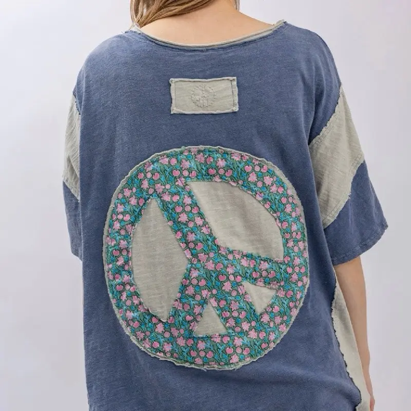 Patchwork peace sign on the back with a raw edge seam detail.