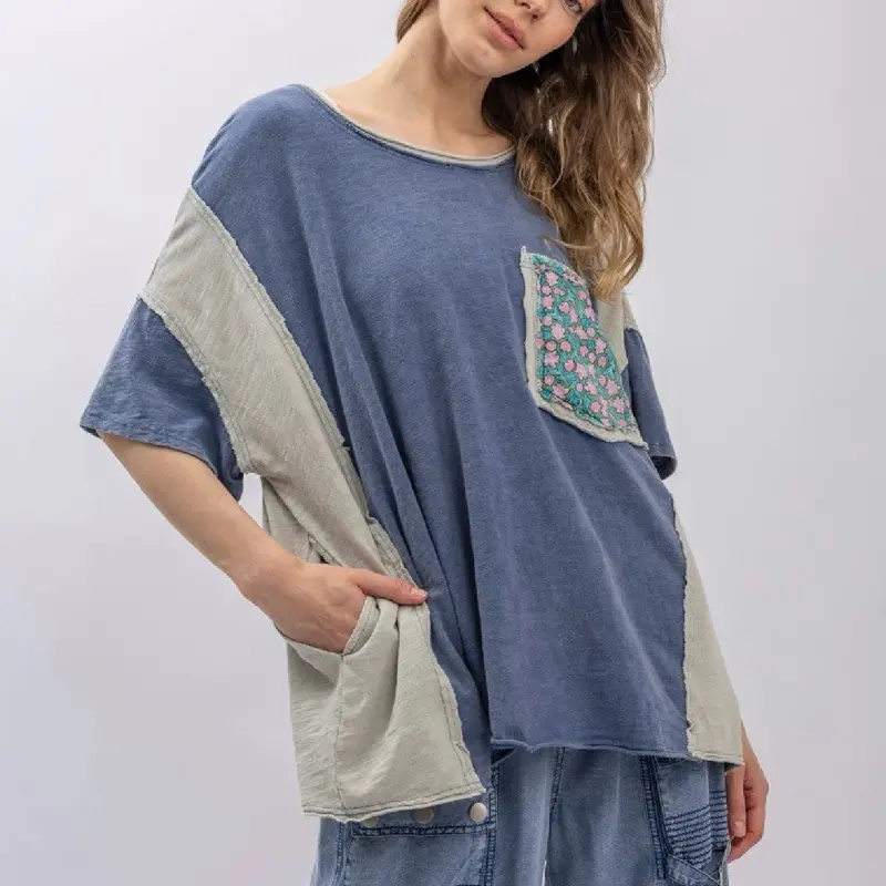 Wanderlust Peace Tee - Denim with Floral Pocket Design for Women