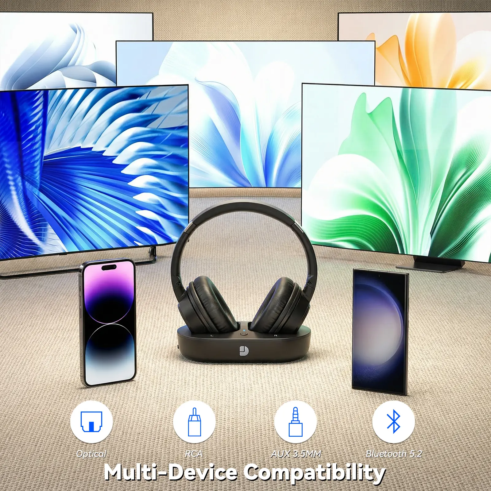 Dytole Wireless Headphones for TV, TV Headphones Wireless for Seniors, Versatile Charging Dock with Transmitter, Instant Audio Sync, 65-Hour Battery Life, Ideal Gift for Parents & Seniors