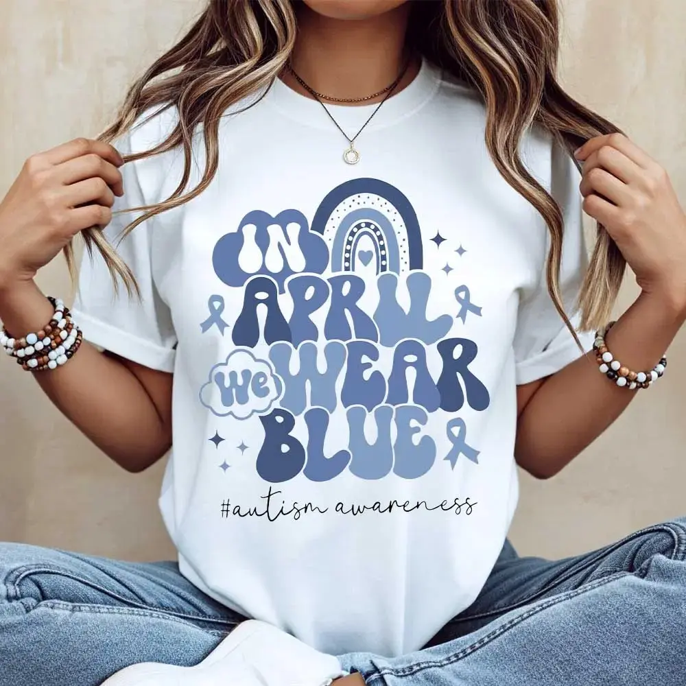 April We Wear Blue Shirt, Autism Awareness Ribbon Rainbow Tee, Women Girls Casual T Shirt, Autism Awareness Month Gift