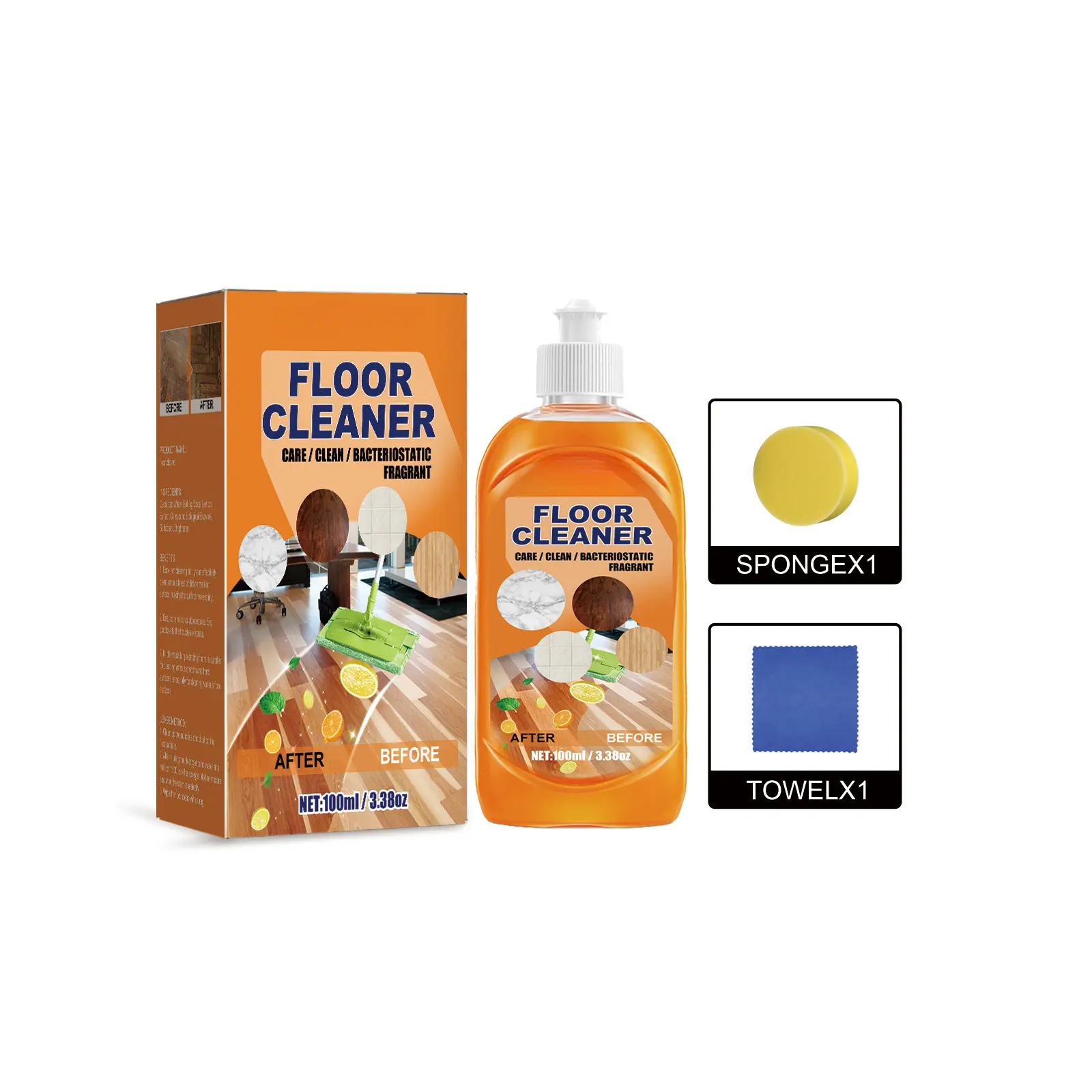 Welcome to our's shop*[shopping tips]:*☆The products in the store are in stock.☆Before placing an order, receive coupons to enjoy more discounts (enter the store homepage to receive).☆If you have any shopping questions, please contact our customer service.☆We are committed to providing every customer with the highest standard of customer service.☆Be our fan and get more discounts.Net Content: 1setProduct Name: Floor Cleaning Agent SetKeywords: Floor CleaningGross weight: 117gIngredients: Sodium lauryl ether sulfate, dipropylene glycol methyl etherPackaging dimensions: 12.3*5.5*5cmProduct dimensions: Cleaner: 12*4.5cm, Cloth: 20*20cm, Sponge: 6.5*6.5*2.5cmBox Gauge: 56*36 * 21.5cmPacking Number: 100PcsWeight of one box: 12.45kgShelf Life: 3 YearsStorage method: Please store in a cool and shaded place*[Tips]✔About the color difference: the products are taken in kind, because the light angle, the display and other objective measures will cause ascertain color difference, please understand.✔About size: Due to different shooting angles, it will cause certain visual errors.The product description has detailed size description.it is recommended that buyers purchase their own ruler when purchasing.✔About damage. : We solemnly admit that the parcel may be damaged during transportation. You can contact customer service staff to help you within 24 hours after receiving the product.