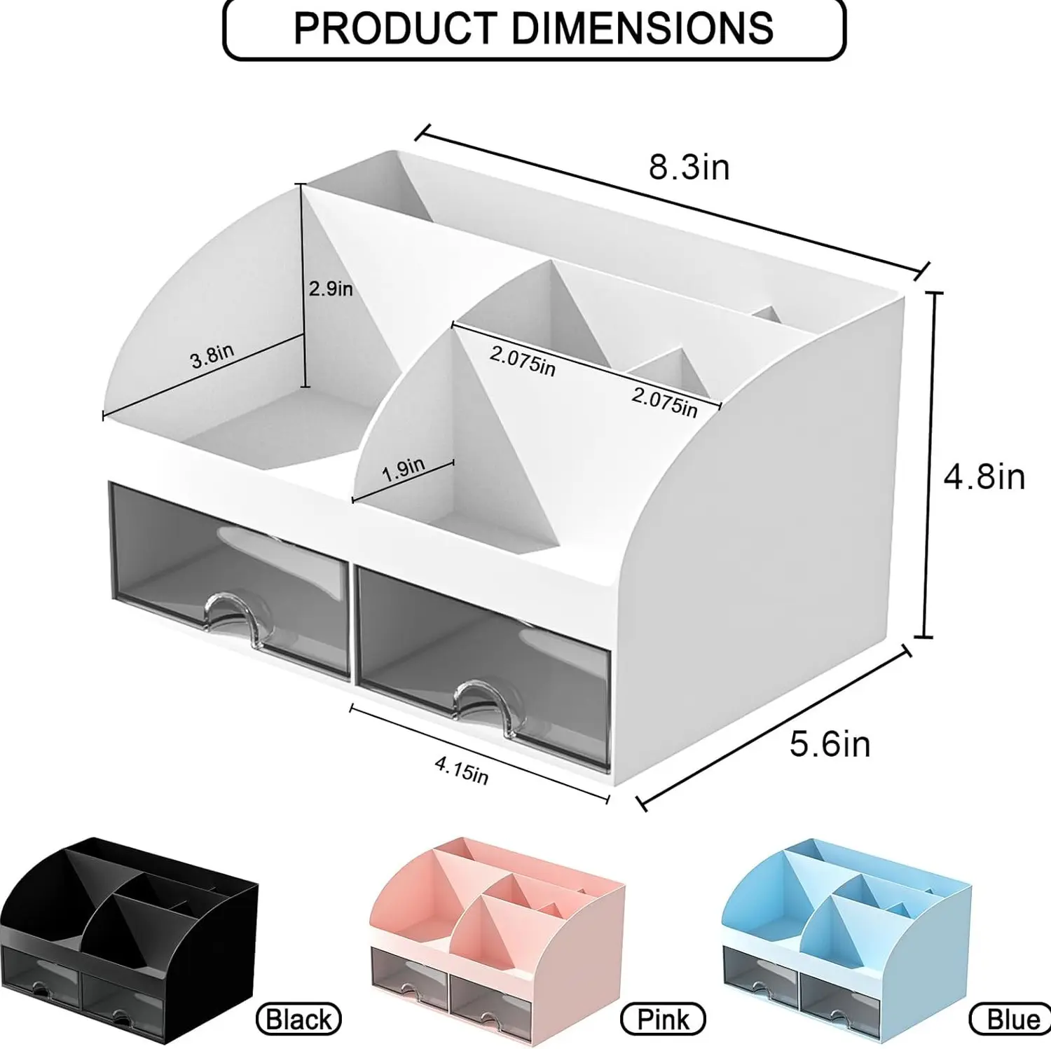 Compact size (8.3" x 5.6" x 4.8") with 6 compartments and 2 drawers for organized storage. Separate sections help you arrange cosmetics and daily essentials neatly. Transparent drawers make it easy to locate items quickly.