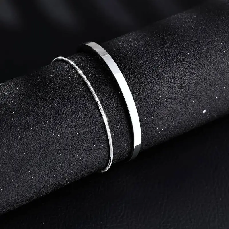 This minimalist dual-style set is ideal for stacking. It features a silvery smooth bangle and a snake chain bracelet. Perfect for men, fathers, sons, or boyfriends. The understated design makes it a versatile accessory. Ideal for gifting, it combines elegance with simplicity.