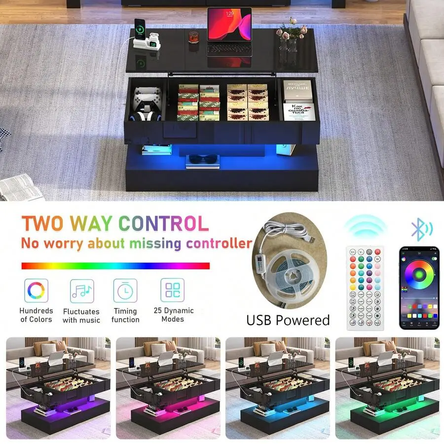 Multiple Storage Space: Our coffee table with LED lights has a large hidden compartment storage space that hides most of the sundries in the living room, and also has a large open 2-tier space in the middle that makes your items orderly and brings you a neat and standardized living room!Also, a 47.2"x23.6" large tabletop provides a wide space for daily living room use and work.