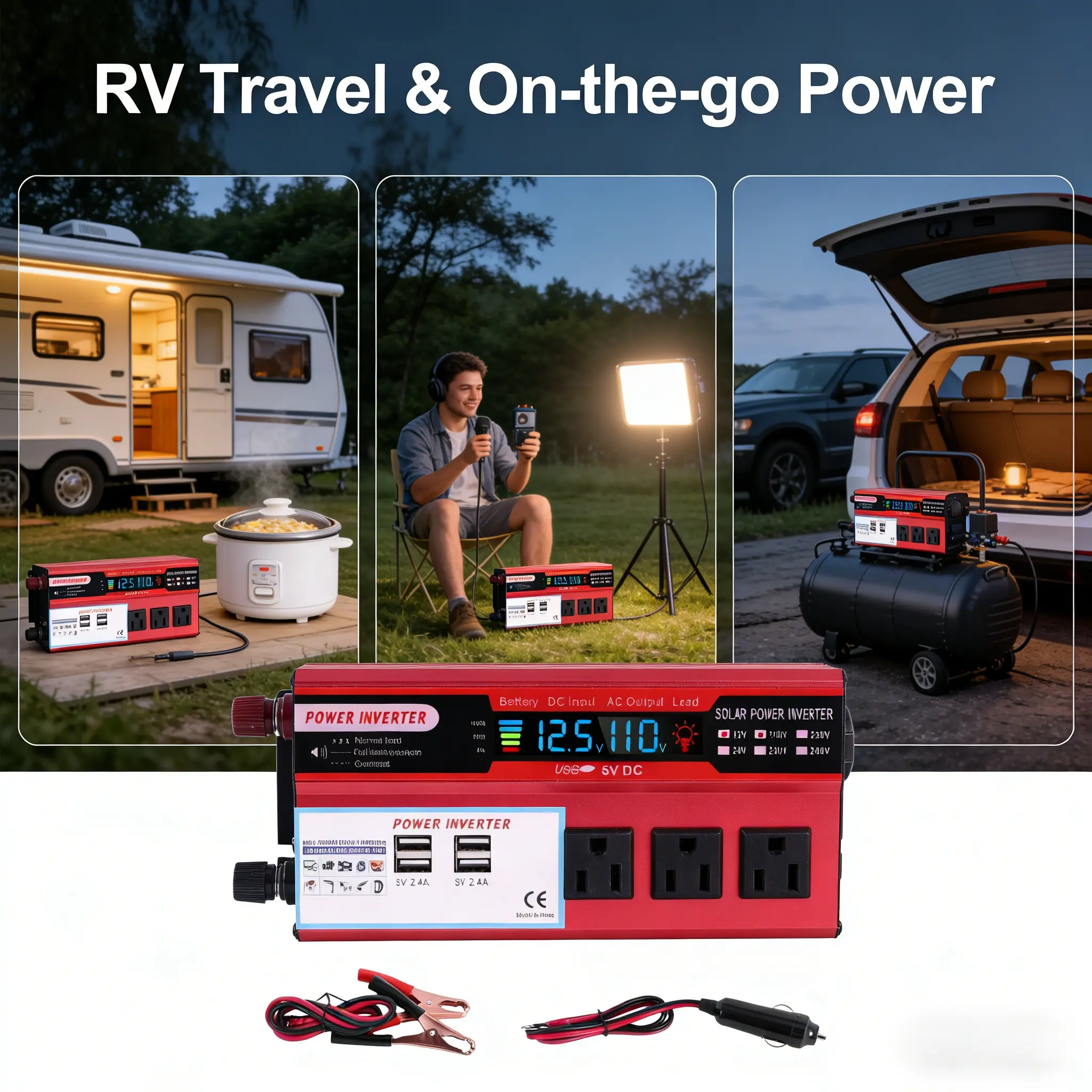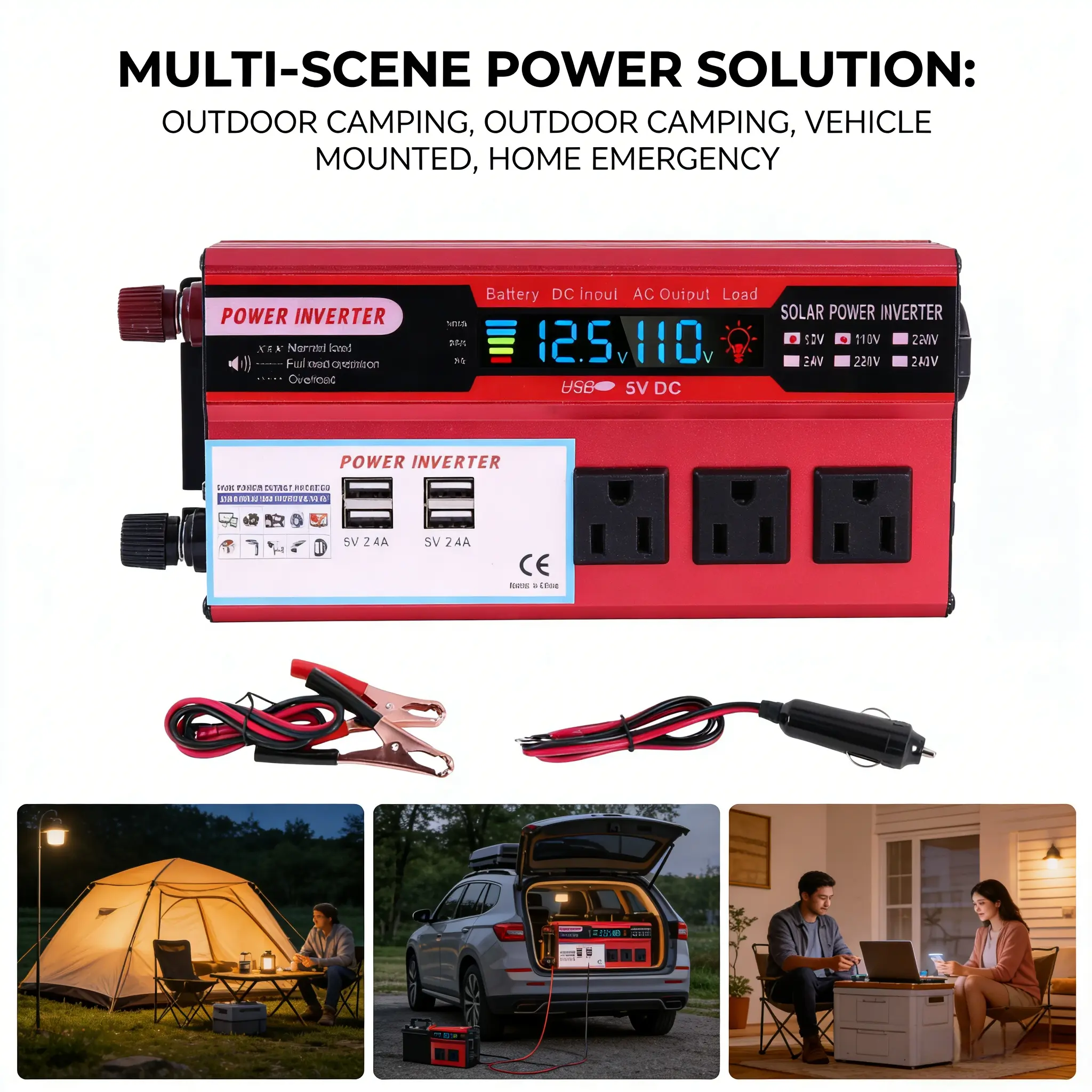 Transform your vehicle's DC 12V to 110V AC with this versatile inverter. Perfect for outdoor camping, RVs, trucks, boats, and road trips. It features 3 AC sockets and 4 USB fast charging ports. Ideal for emergency power backup. Peak power reaches 5000W, ensuring you have the power you need.