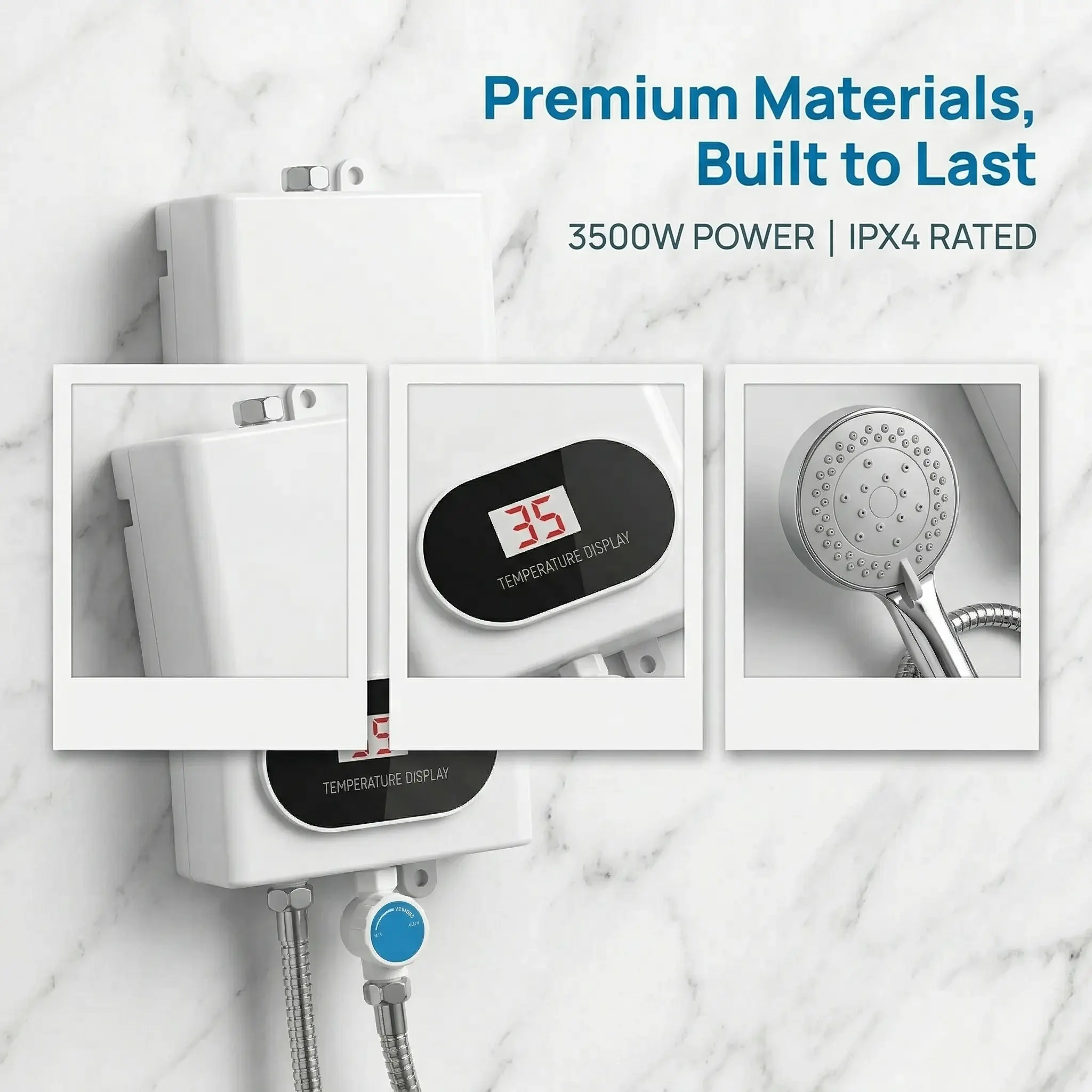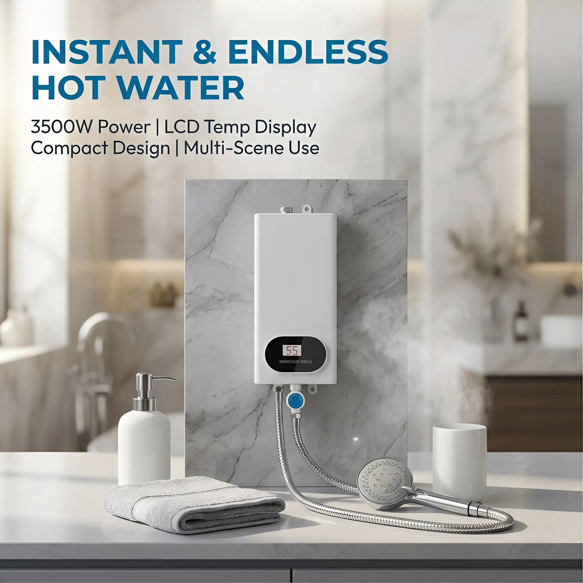 Powered by3500W high-efficiency heating, this unit heats water instantly as it flows.