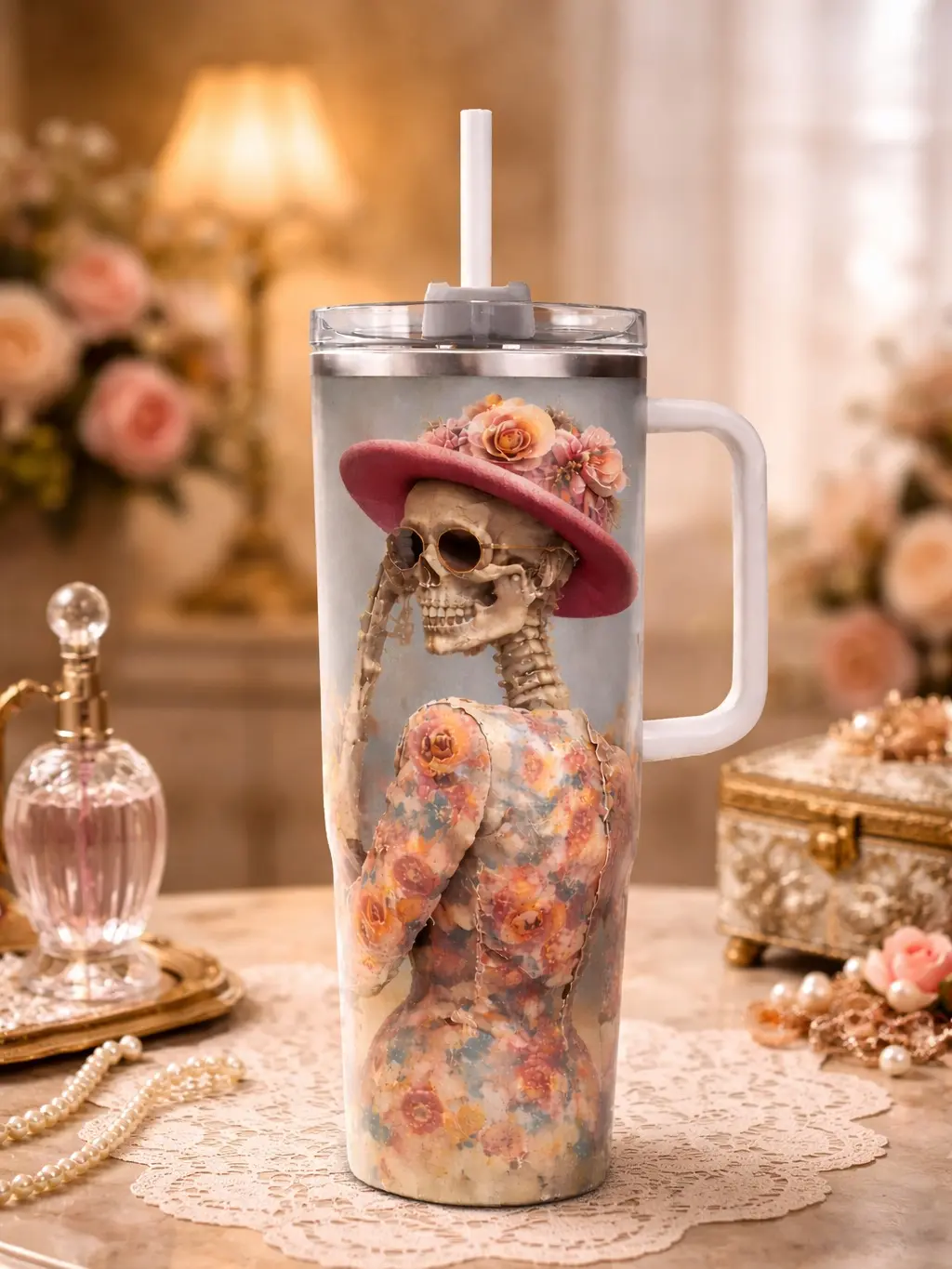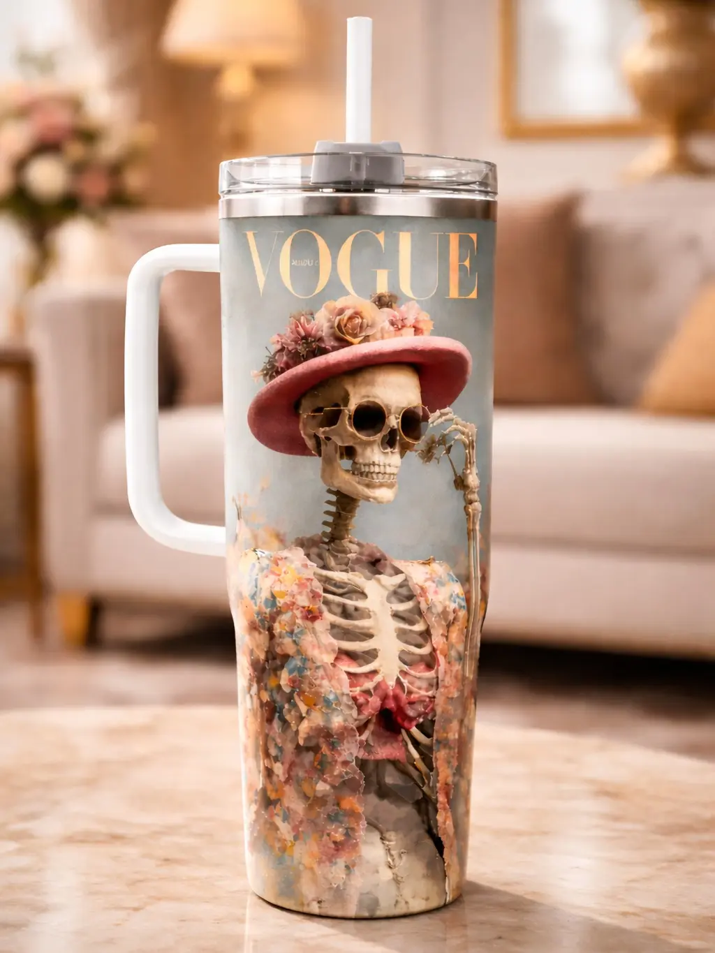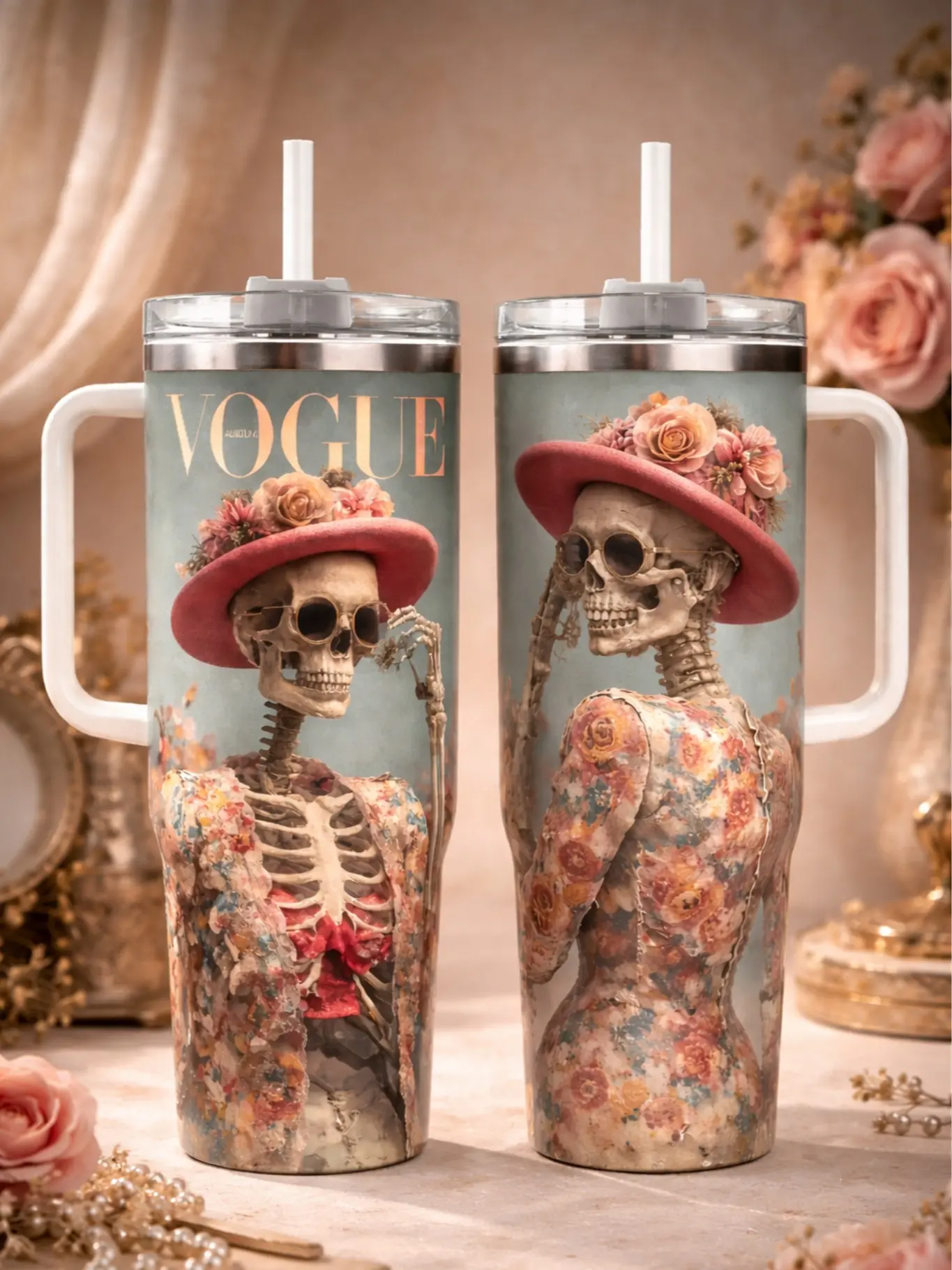 VOGUE Skeleton Tumbler – Day of the Dead Mexican Inspired Floral Skull Design, Insulated Travel Cup, Unique Drinkware, Perfect Gift for Fans open for sale