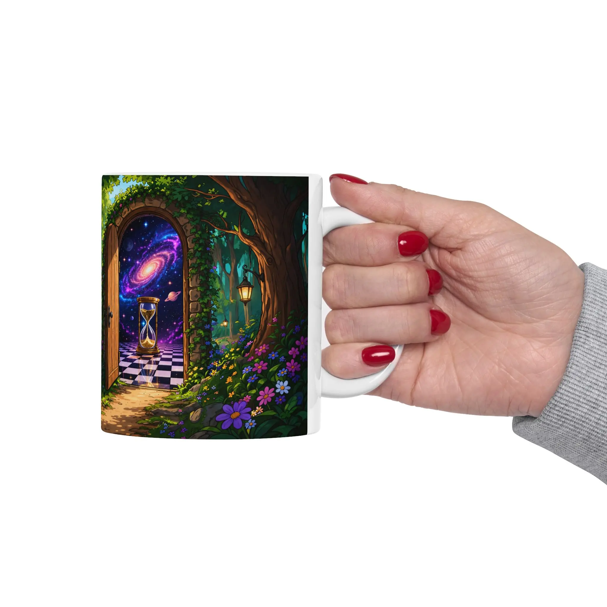 - Glossy white ceramic with comfortable C-handle