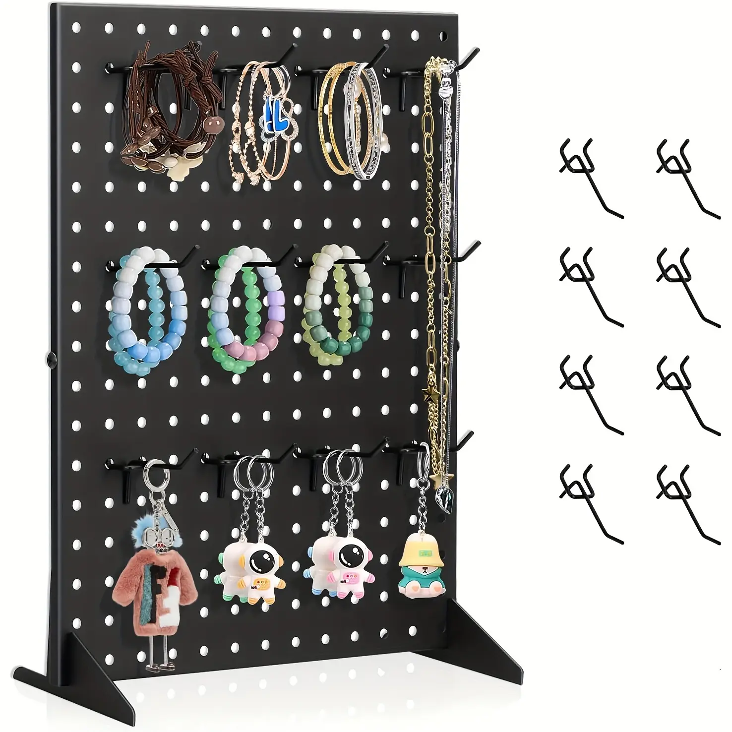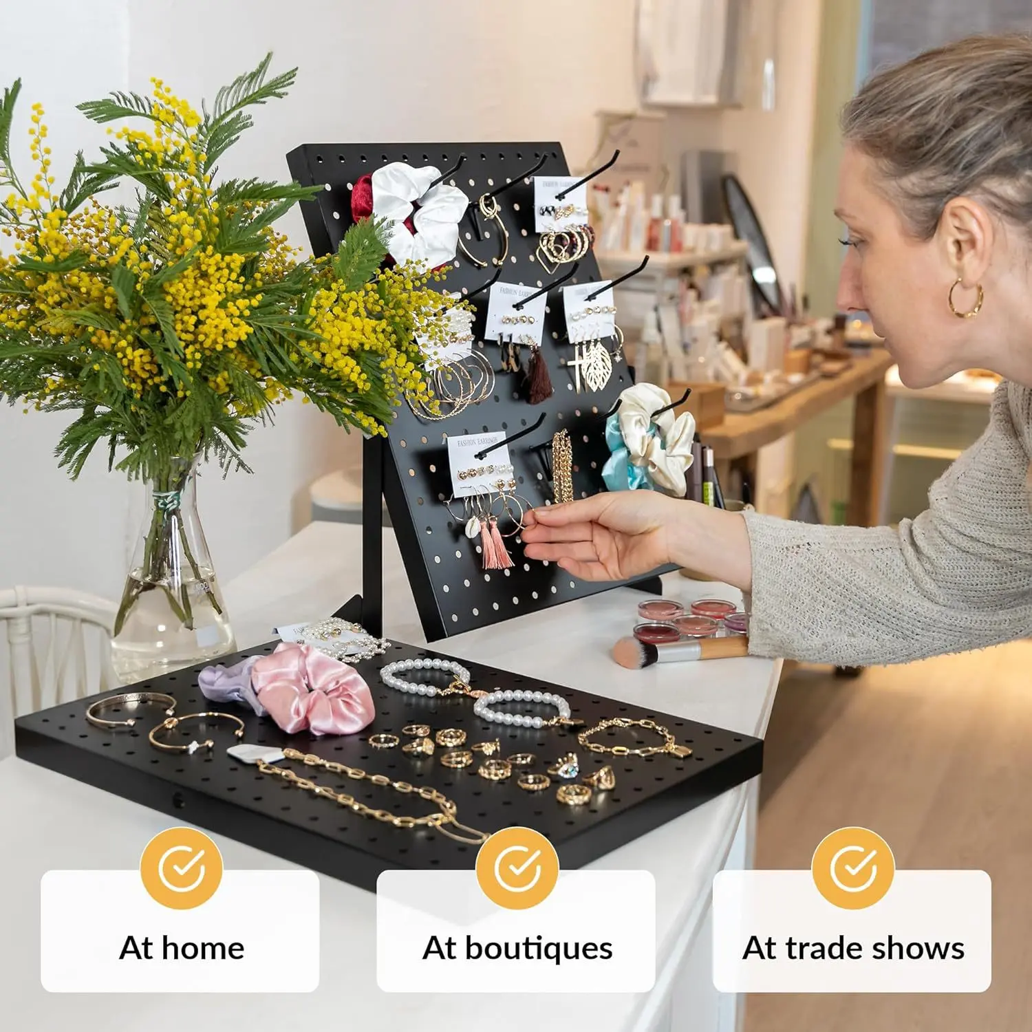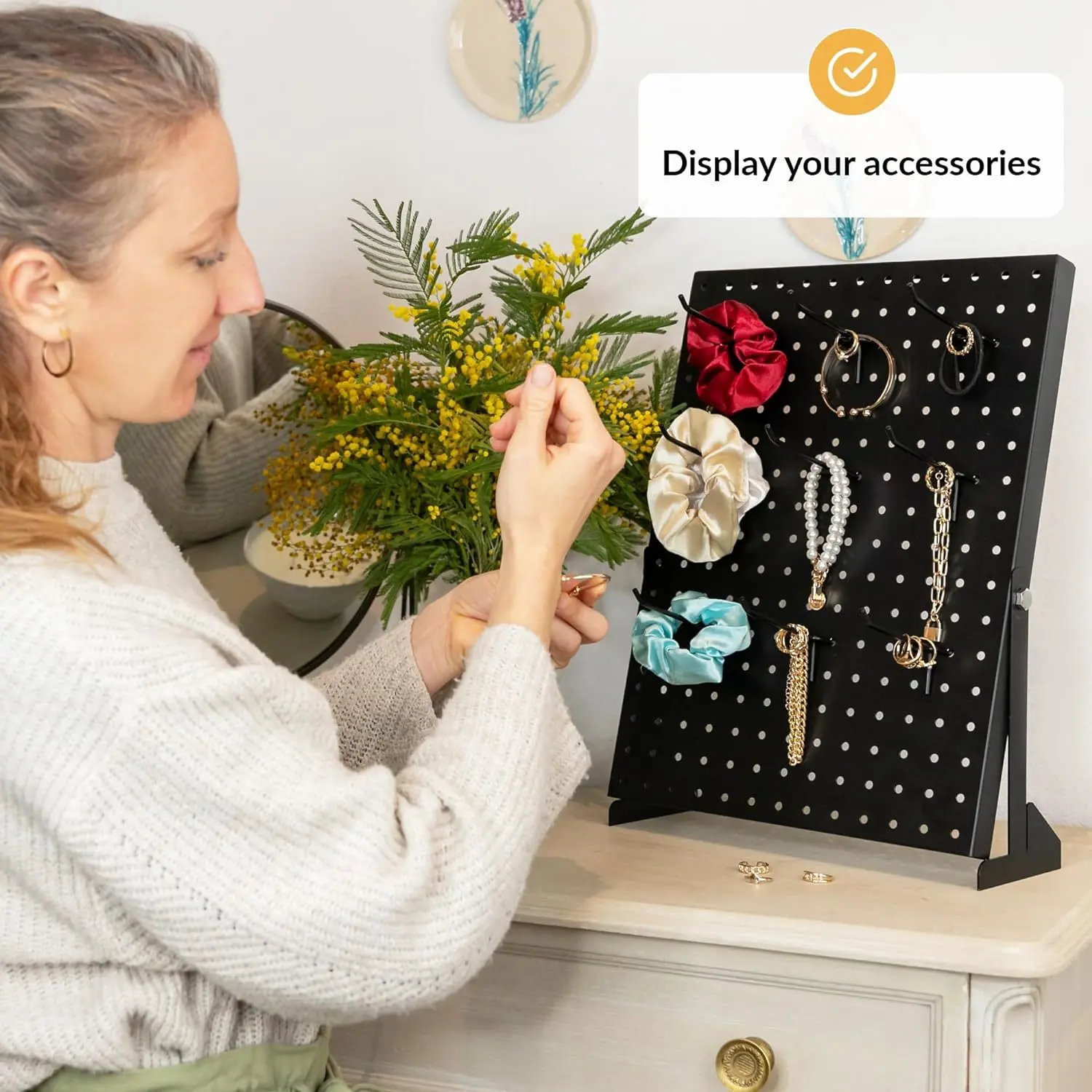 Earrings, necklaces, bracelets, scrunchies, and hair ties—all can be held here. This organizer is a versatile solution for keeping your accessories tidy and visible. It's ideal for vanity organization and shop displays.