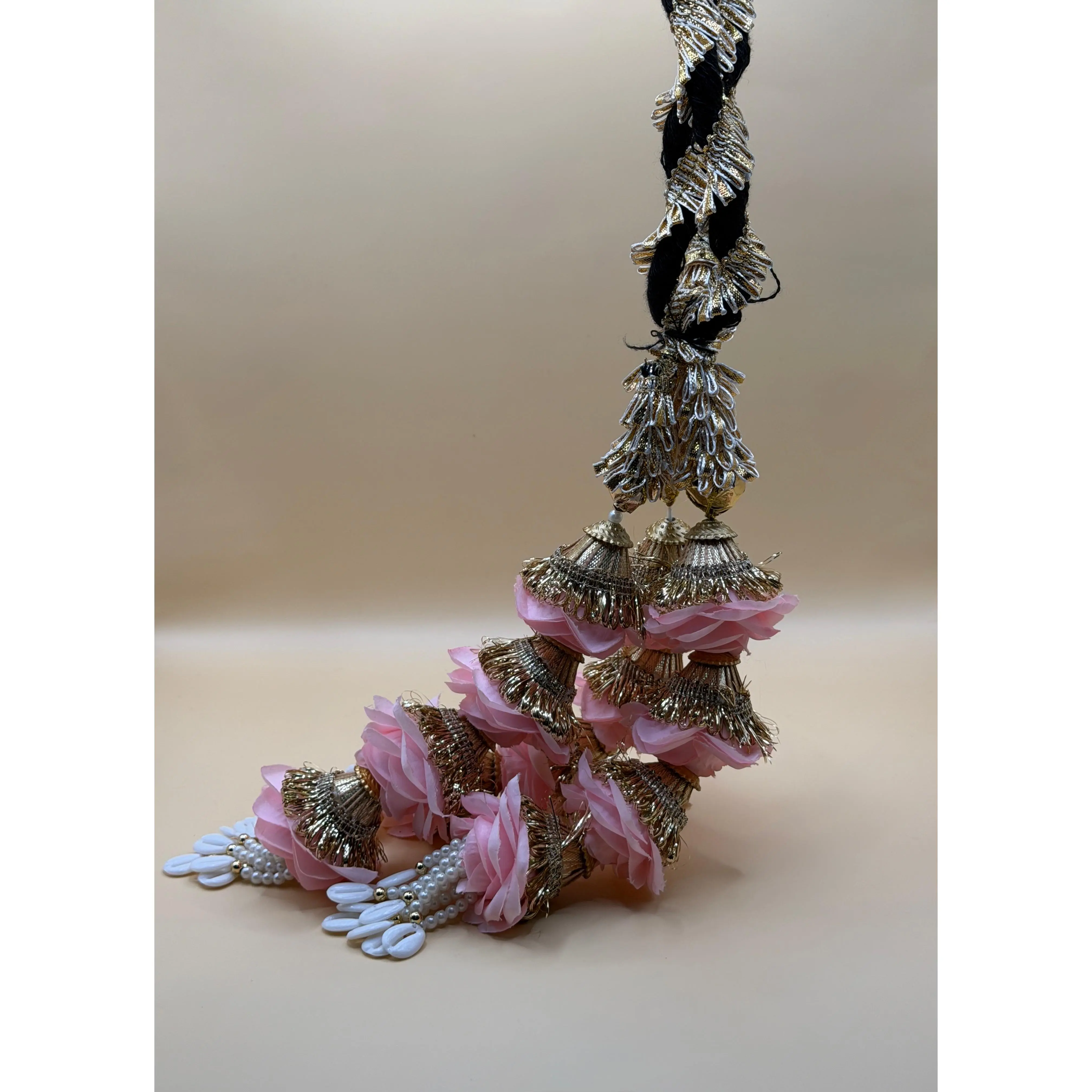 Traditional paranda crafted with rich black threads and elegant gold accents, adorned with delicate red and multi roses embellishments for a soft, feminine, and festive braided look.