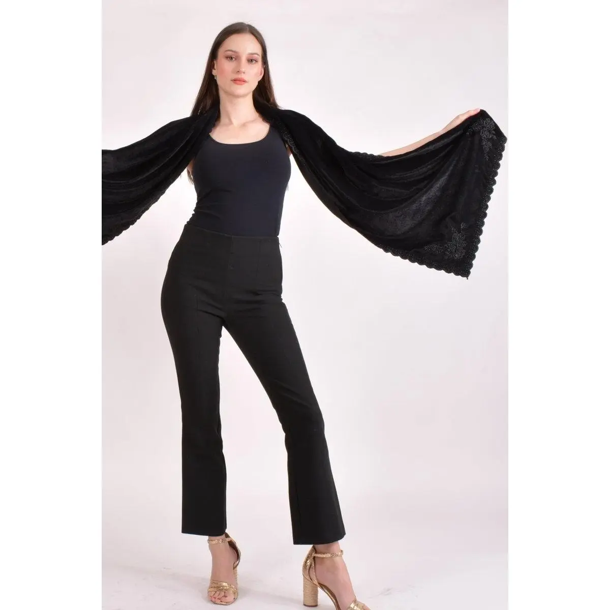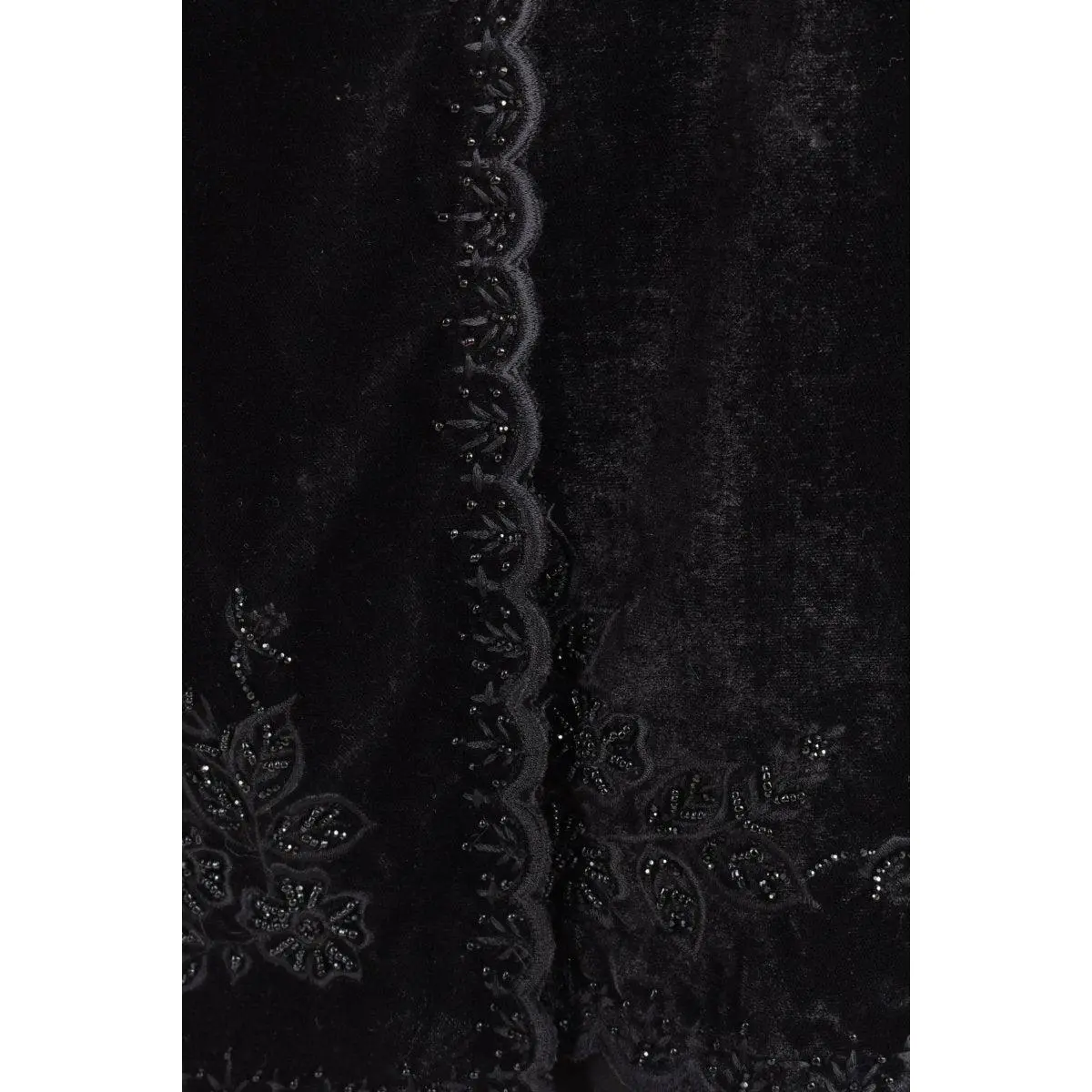 Luxurious black velvet meets intricate handcraft in this stunning embroidered scarf. Delicate floral hand embroidery embellished with beadwork runs along the border, finished with a scalloped edge that adds elegance and refinement. Rich, weighty velvet drapes beautifully as a wrap, shawl, or evening accessory — a piece that elevates any outfit instantly. A versatile luxury accessory that pairs effortlessly with ethnic and western evening wear alike.