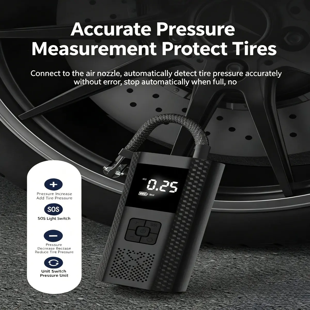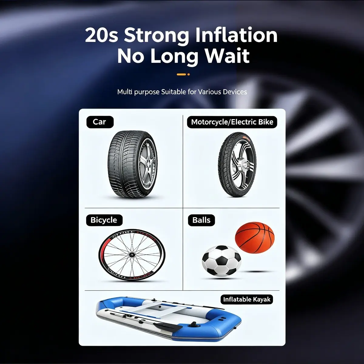 🚗 Your Ultimate On-the-Go Tire Inflation Solution!Tired of being stuck with a flat tire on the road, or struggling with bulky, corded air pumps? Our Wireless Smart Tire Inflator is the game-changer you need! Compact, powerful, and packed with smart features, it’s your go-to emergency tool for cars, bikes, motorcycles, and more.