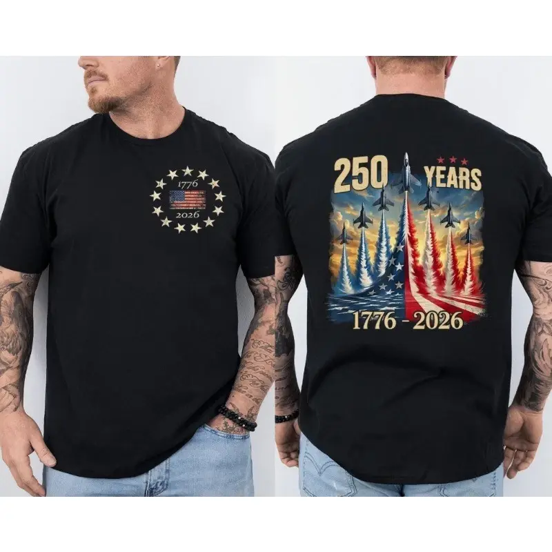Celebrate a historic milestone with this striking patriotic T-shirt, designed to honor 250 years of American pride. Featuring powerful fighter jet graphics on both the front and back, this piece combines modern streetwear style with a strong national spirit. Perfect for casual outings, summer events, or showing your pride at gatherings, it delivers both comfort and standout design.