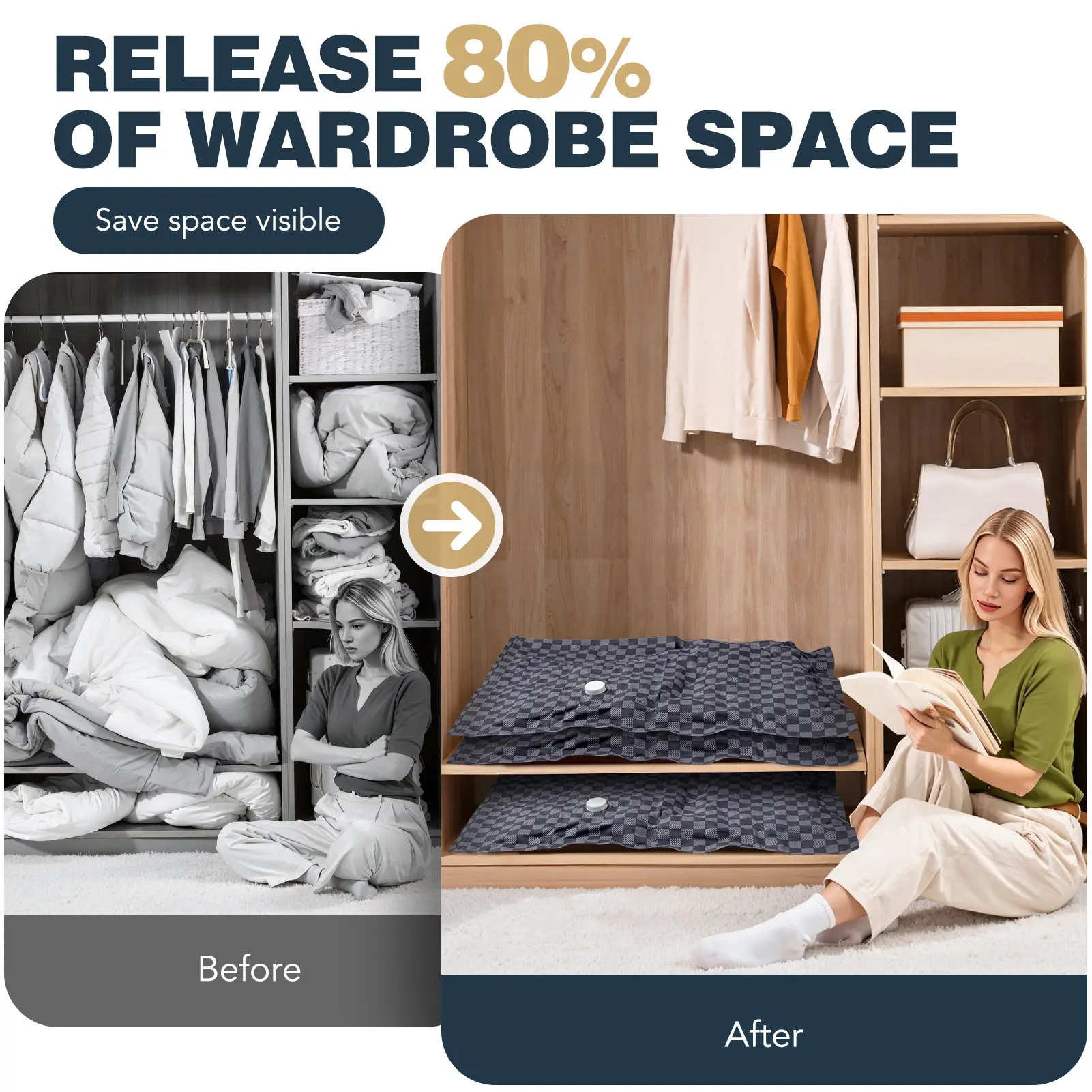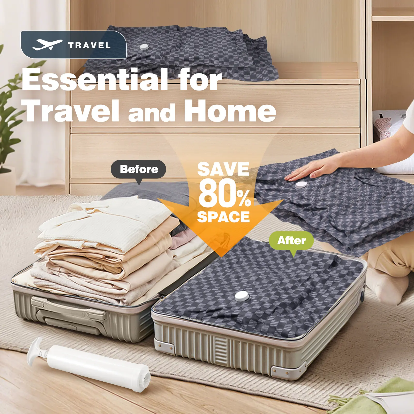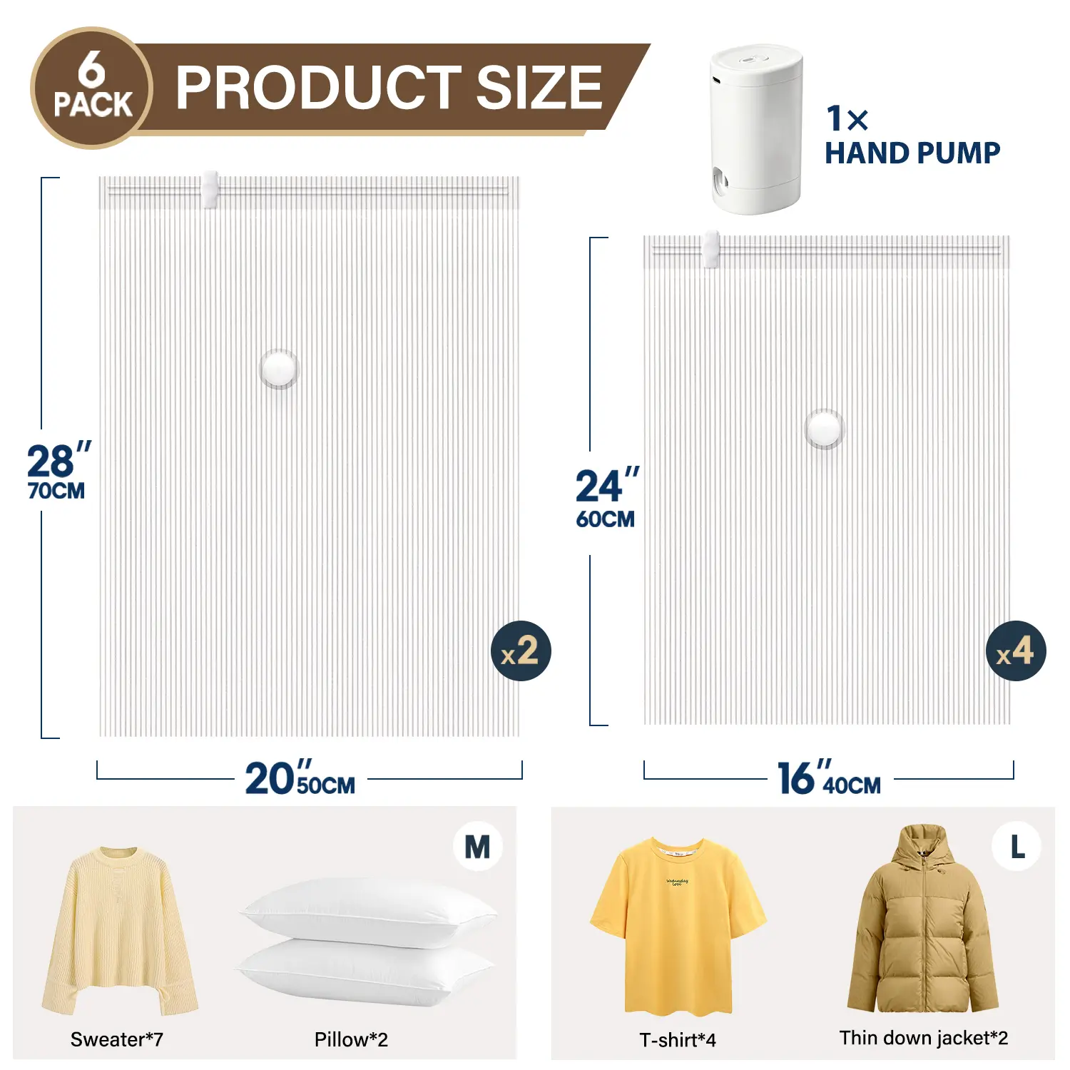 Elevate your travel essentials with our 6 Pack Cloth Vacuum Storage Bags. Includes 2 Large (27.5*19.7 inch) and 4 Medium (15.7*23.6 inch) bags, plus a hand pump. These bags are ideal for luggage, comforters, and blankets. Save 80% space effortlessly. Perfect for all your travel and home storage needs.
