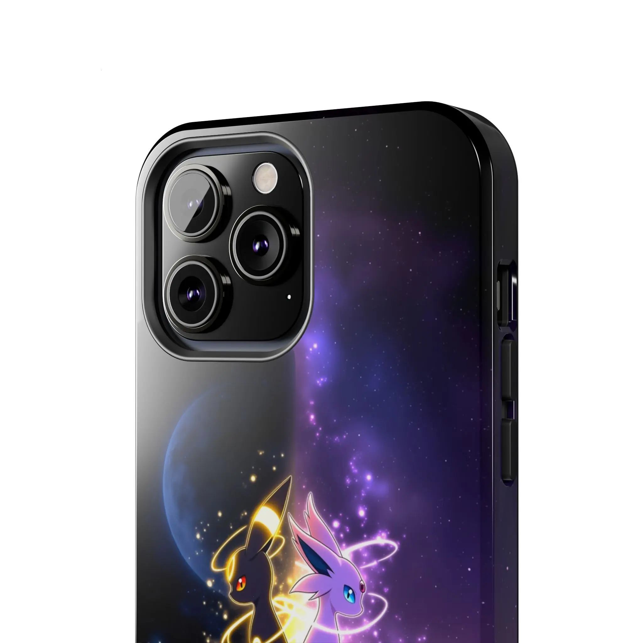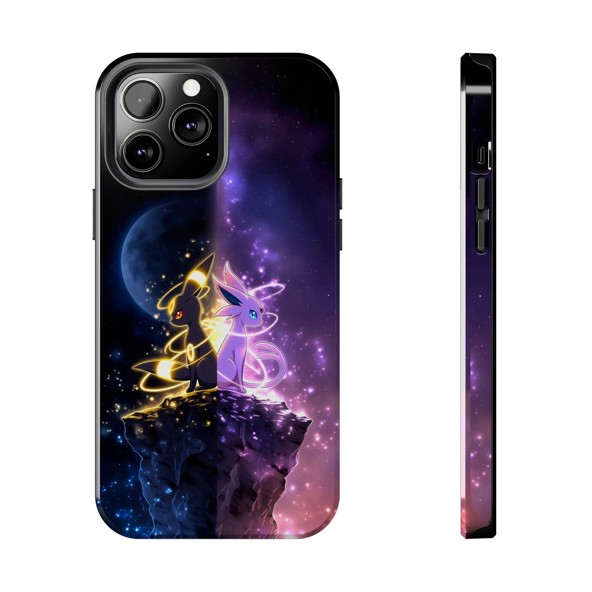 Witness the breathtaking convergence of day and night with this Espeon and Umbreon "Galaxy Peak" themed case. Featuring the psychic-type Espeon and dark-type Umbreon sitting back-to-back atop a jagged cliff, this design splits the world into a starry midnight moonscape and a vibrant cosmic dawn. With glowing aura swirls and a deep nebular background, this case captures the mystical essence of the Eeveelutions in a high-fantasy art style.