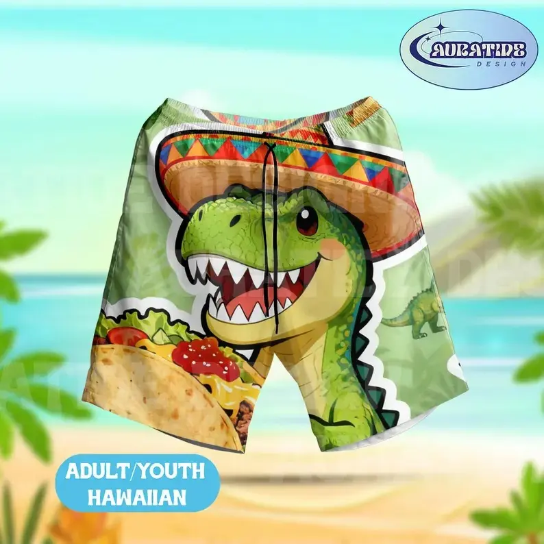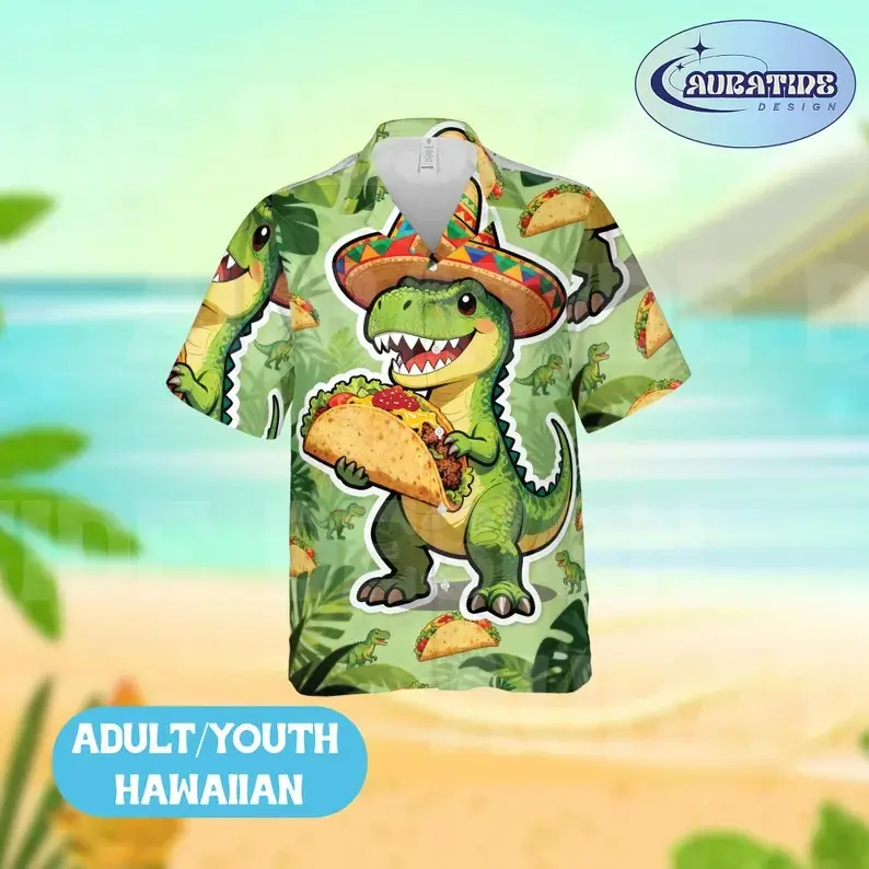 5. Funny T-Rex Eating Taco Sombrero Hawaiian Shirt Shorts Set Men Women Cute Dinosaur Cinco De Mayo Tropical 2PC Loose Matching Beach Summer Aloha Outfit Adults