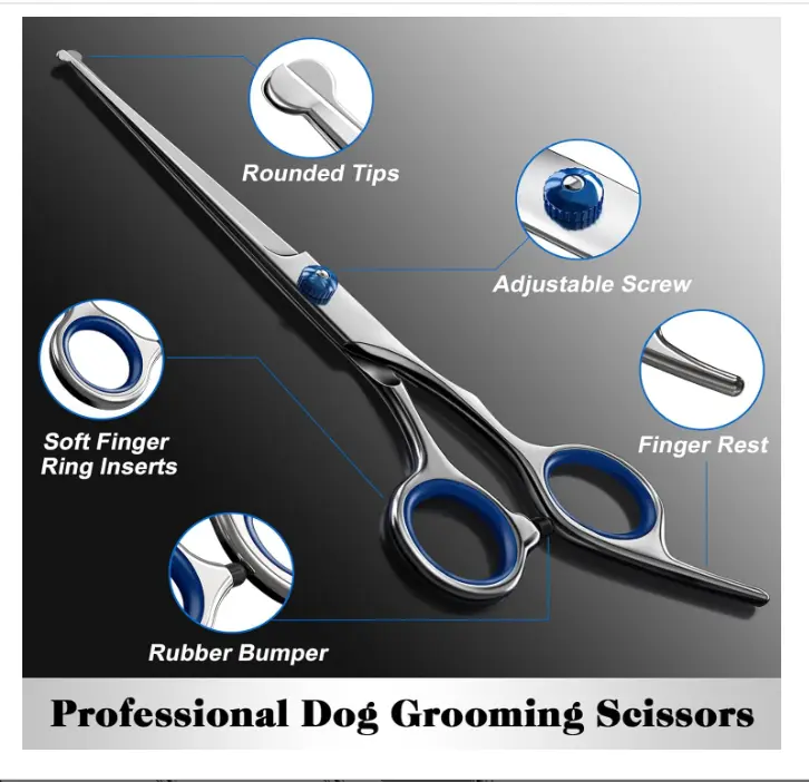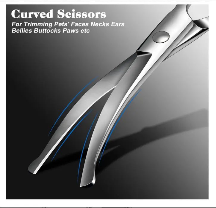 ·【Safe Design】All dog scissors are designed with Round Tips,so you don't have to worry about poking your pet's skin . A silencer between the handles reduces noise from stainless steel contact during trimming, preventing pets from becoming frightened and making grooming more enjoyable. Warm Note: The curved dog grooming scissors' blade design prioritizes efficiency (Quick Contouring), making them ideal for sensitive areas (face, neck, ears, abdomen, rear, paws, etc.)
