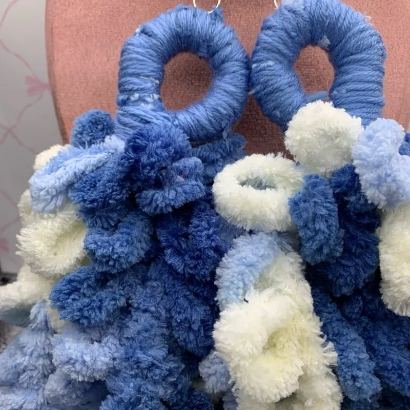 ·These earrings are designed to stand out. The extra-large size ensures they catch the eye. Made from yarn, they add a touch of creativity to any outfit. Ideal for those who love to make a statement with their accessories.