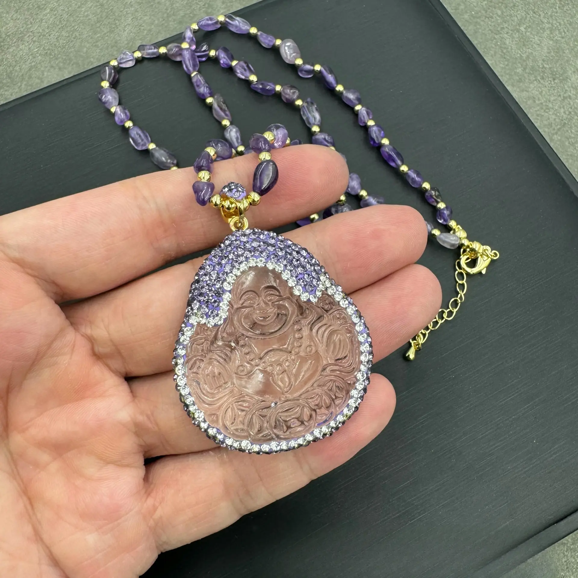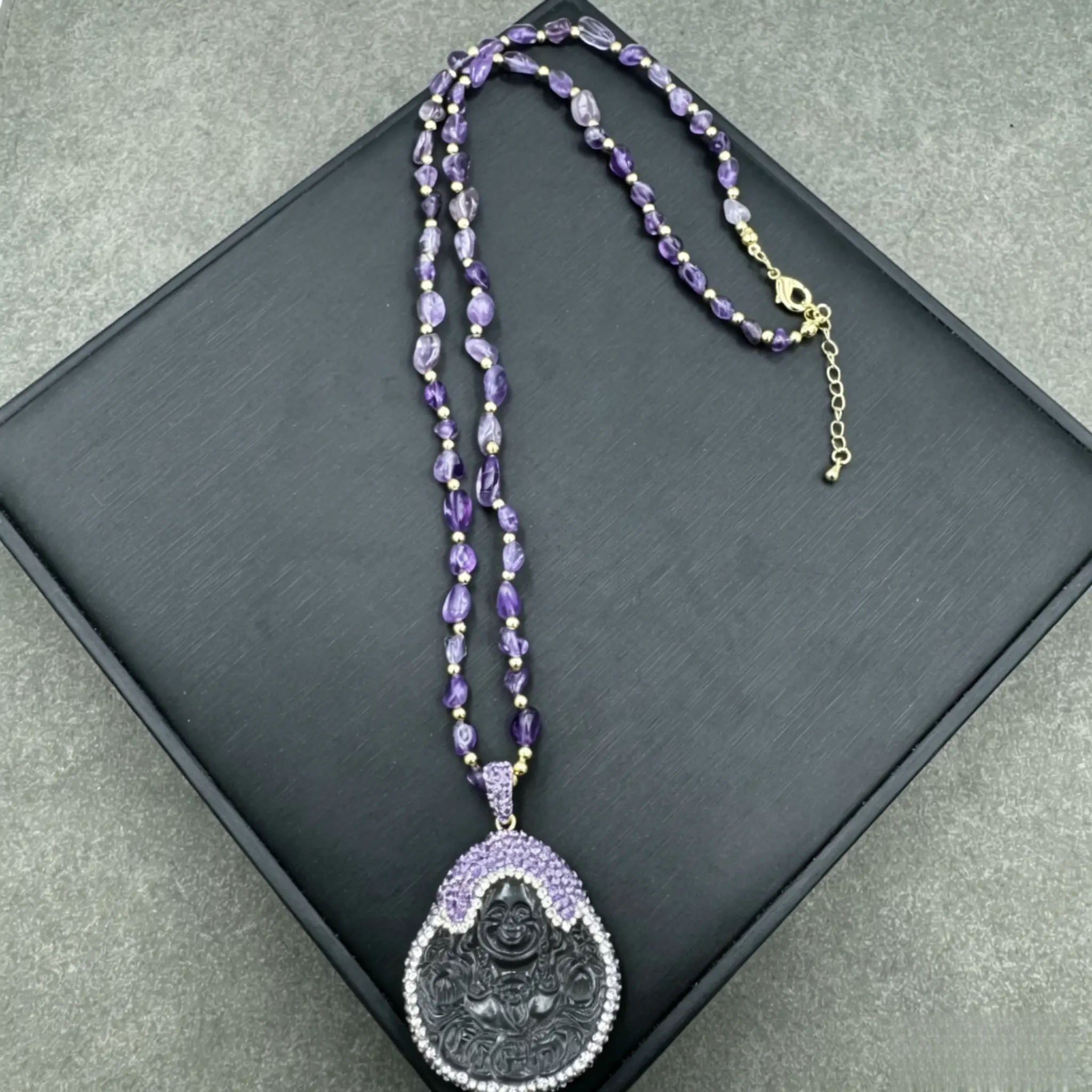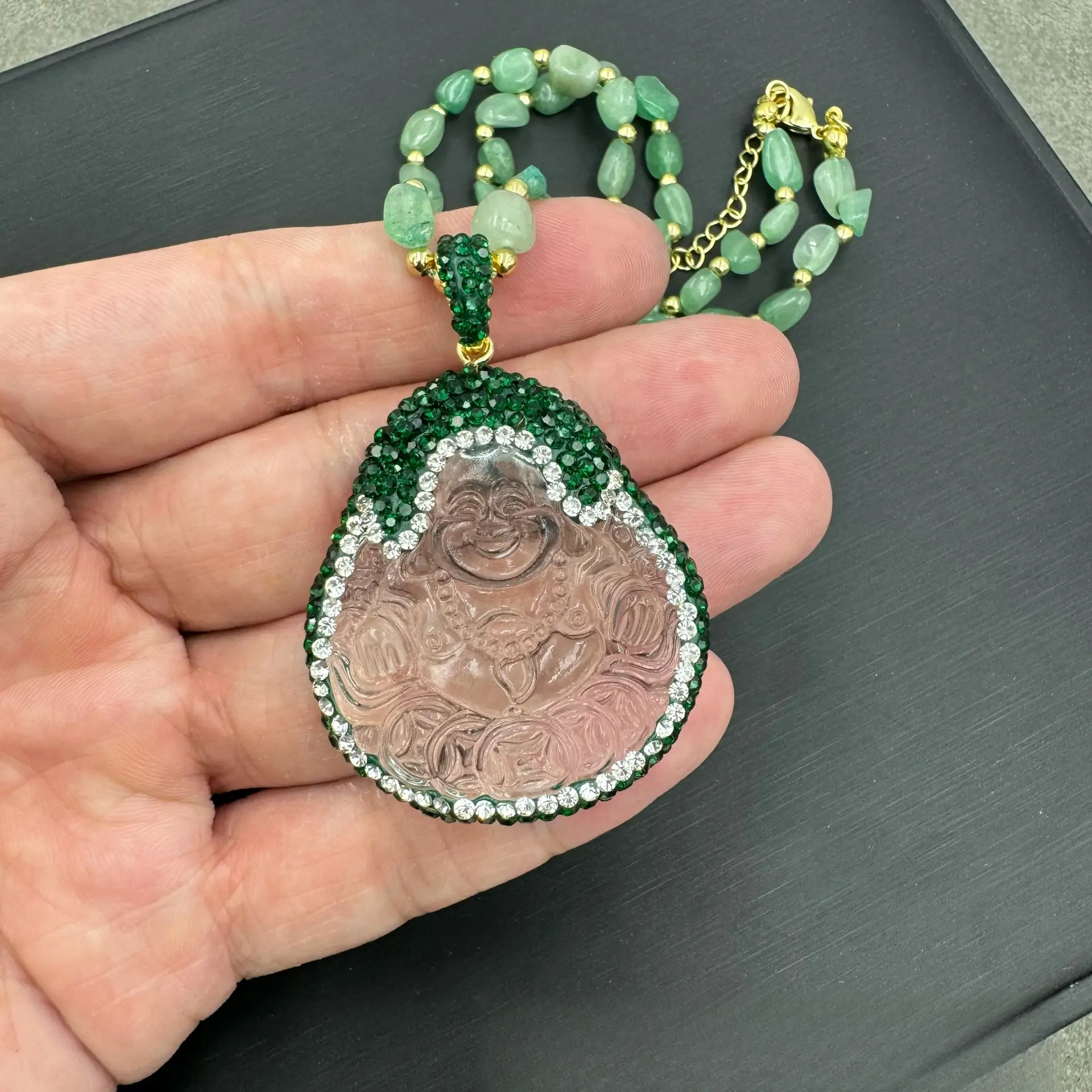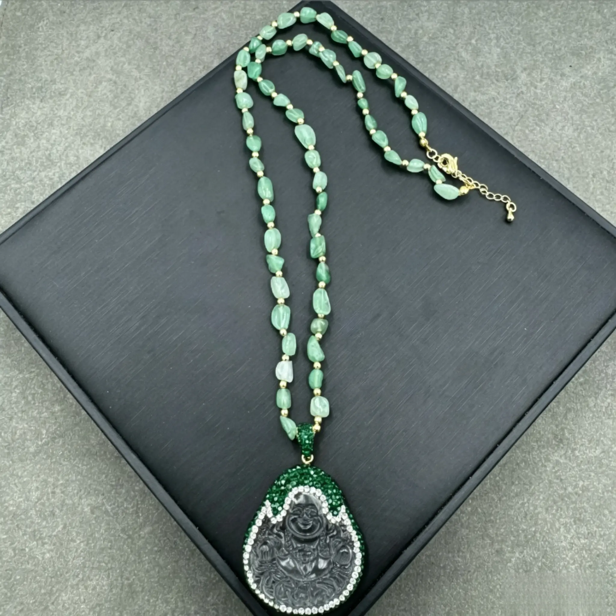 Elevate your everyday style and invite endless good luck into your life with our Unique Laughing Buddha Necklace, the perfect blend of boho charm and spiritual elegance.This handmade inlaid jewelry for women features a stunning laughing Buddha pendant, paired with a hand-strung beaded chain for lightweight all-day comfort.