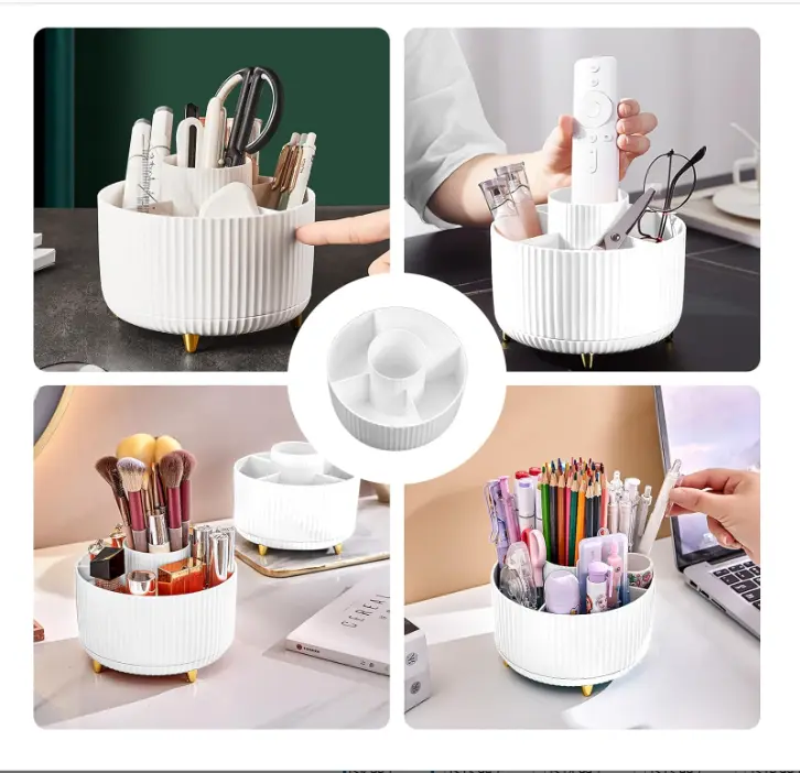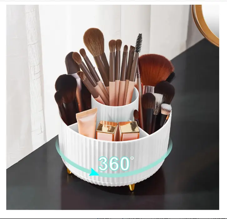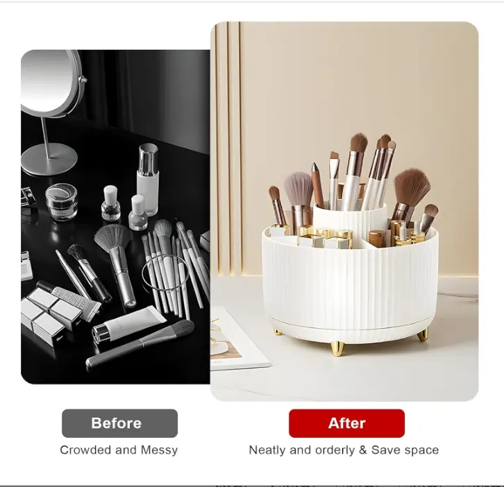 ·Premium Material Rotating Makeup Brush Holder:The rotating makeup brush holder is made of durable Premium plastic, which ensures its durability and security from injury and breakage. And the smooth surface and rounded edges won't cause any harm to your desk or yourself.Cosmetic storage box requires no installation and can be used directly