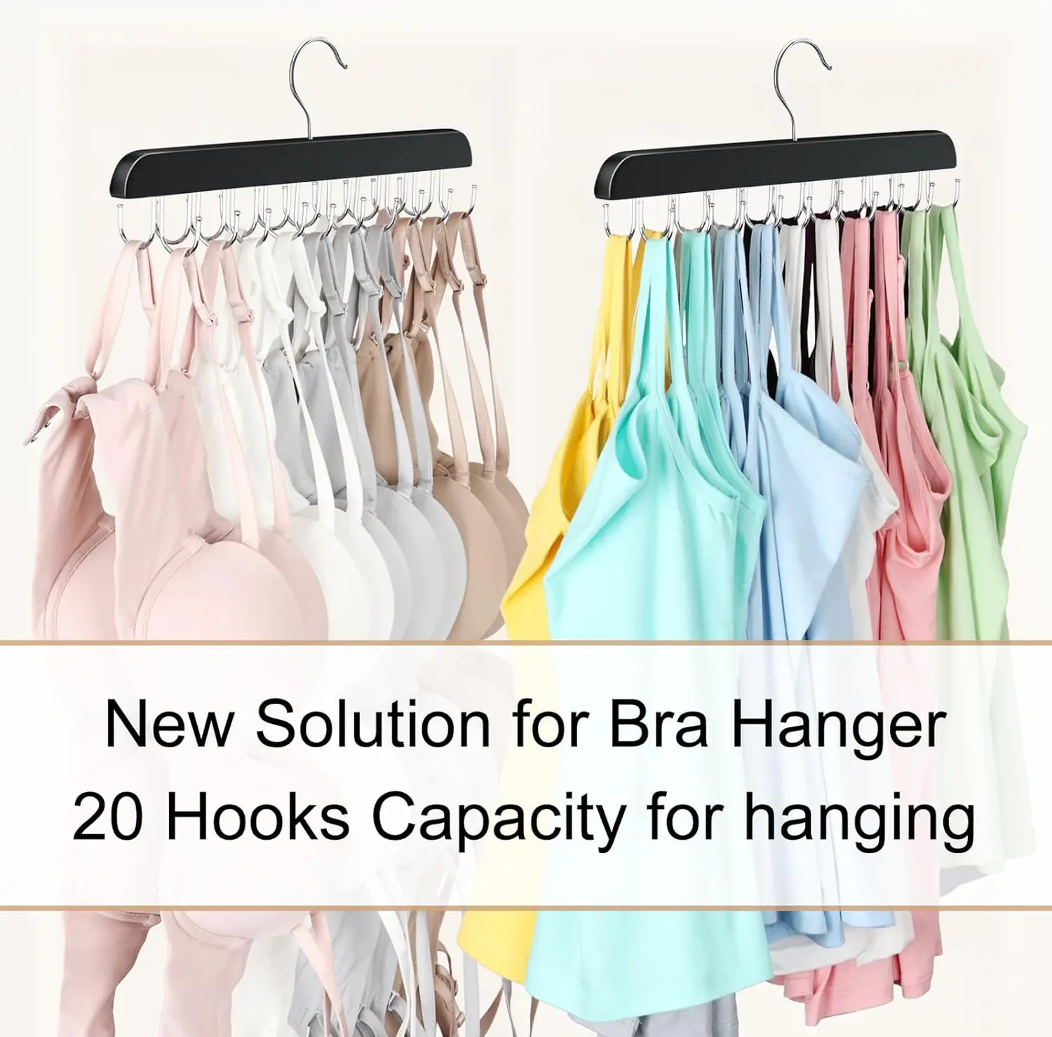 ·Featuring 20 hooks, it provides ample room to neatly hang tank tops, bras, scarves, belts, and ties, preventing clutter and tangled straps.