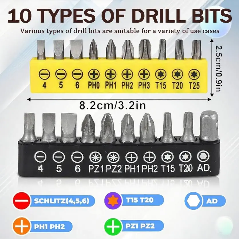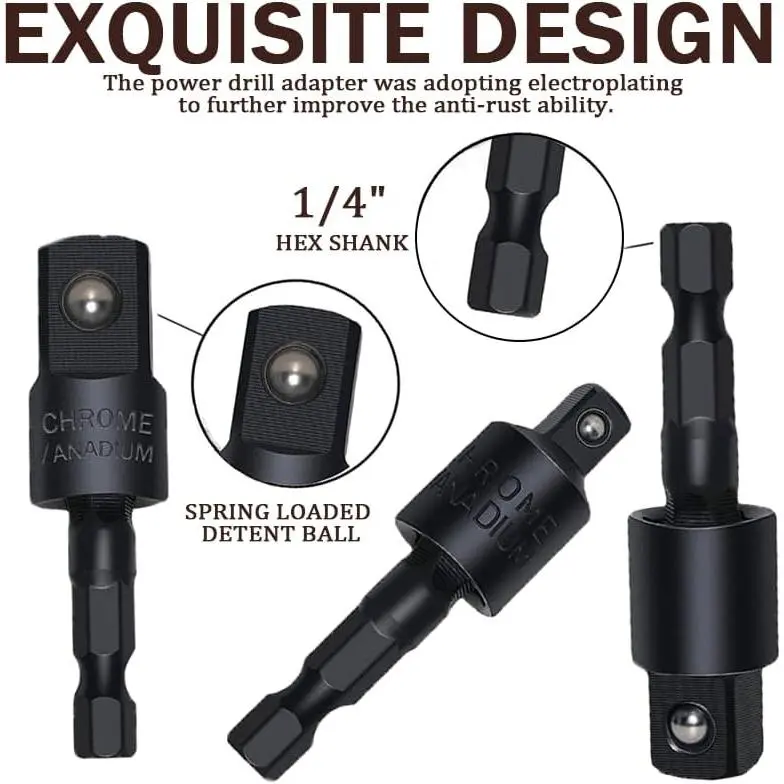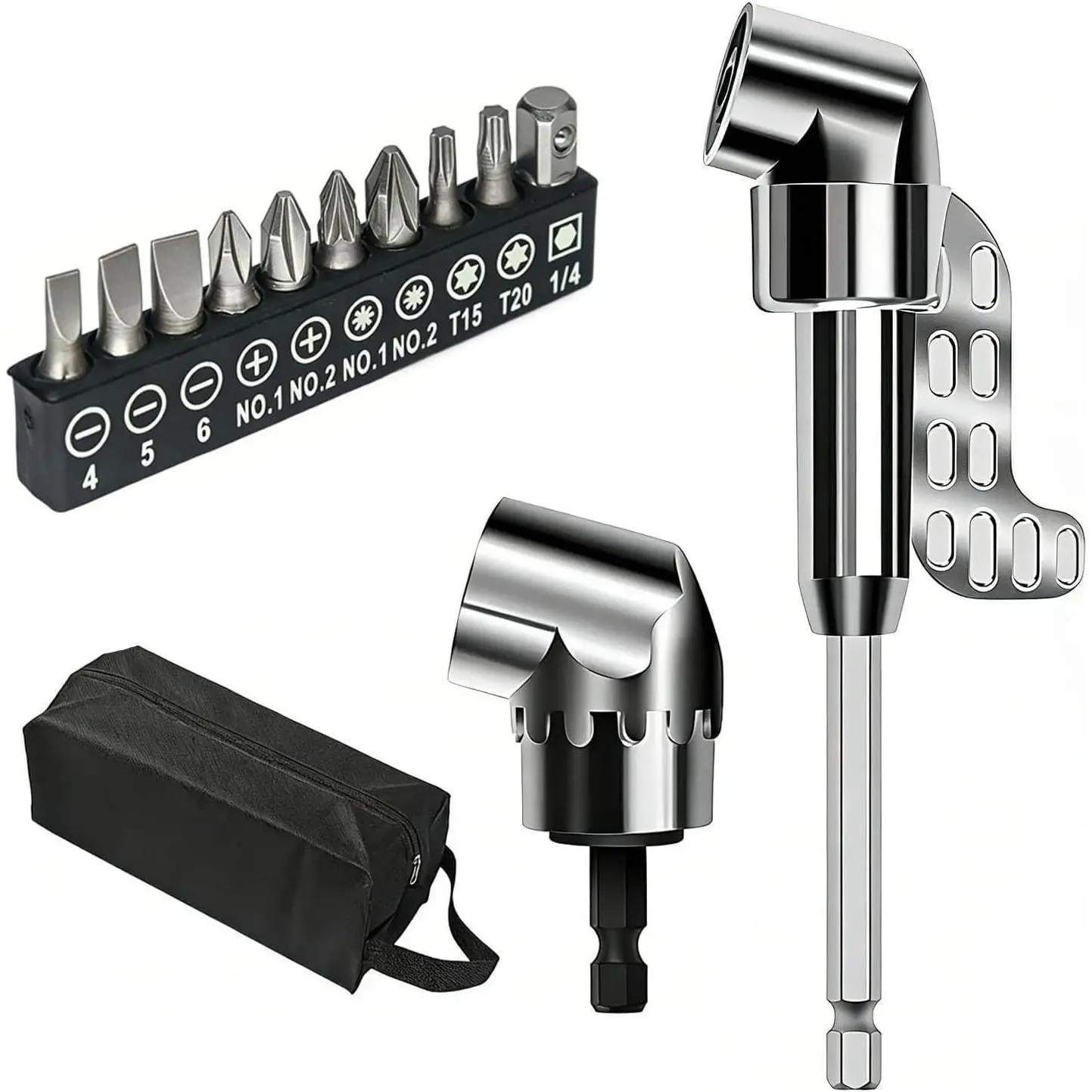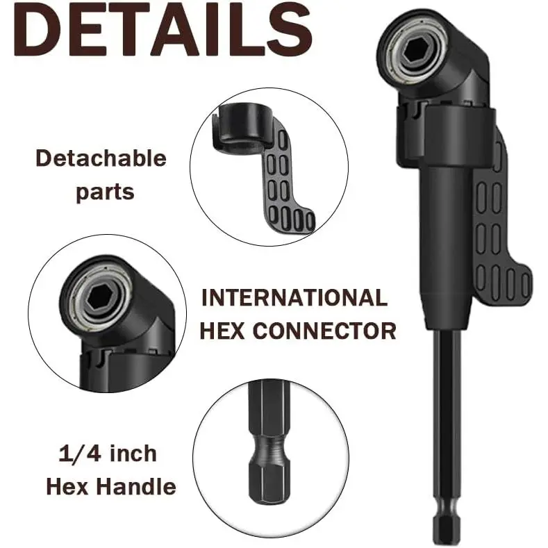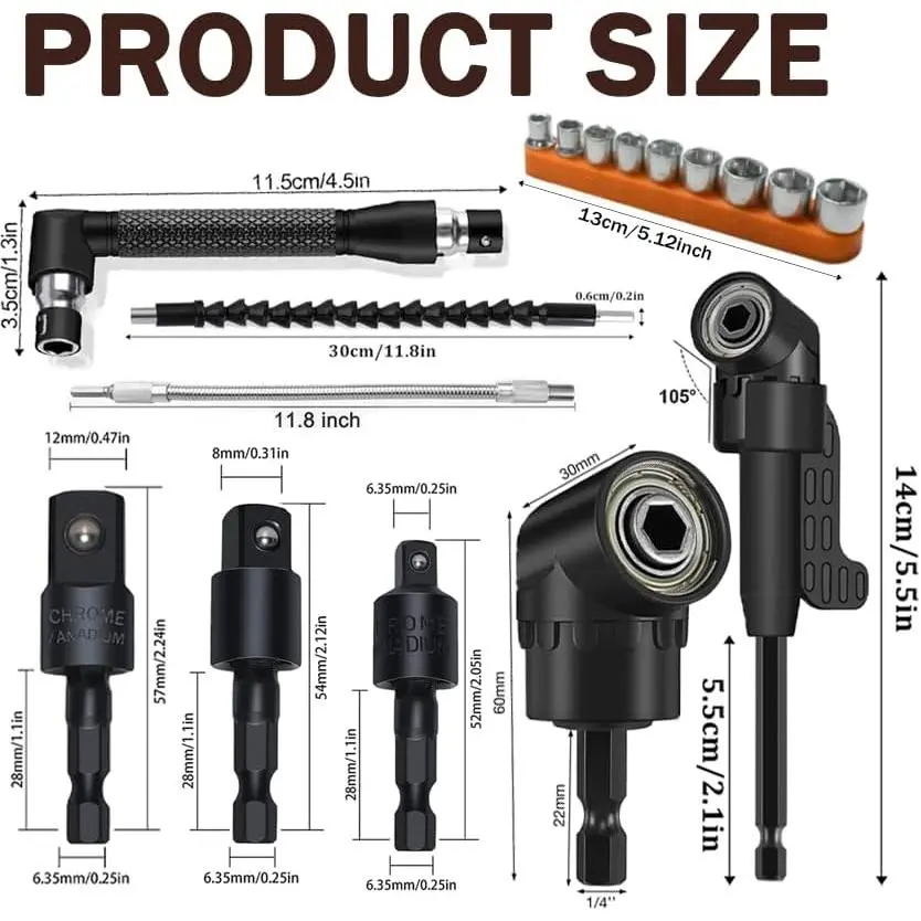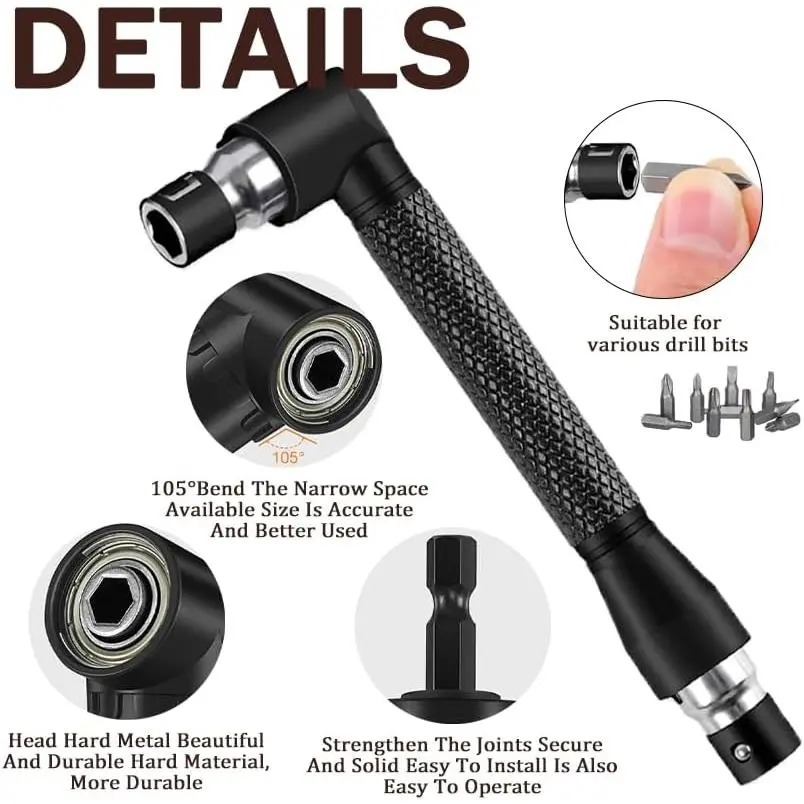 3pcs Rotatable Socket Adapter: 1/4 3/8 1/2 in hex socket adapter .360° rotatable hex shank impact driver socket adapter used in the installation of pneumatic screwdriver, electric screwdriver, pneumatic drill, manual screwdriver and other installation for the hexagonal tool.2pcs 105° Right Angle Drill Accessories: 105° Right Angle Drill Accessories (long and short) made of high-quality steel material, Can work in narrow spaces .It is suitable for chargi ng drills, screwdriver chucks, and manual wrenches.2pcs Bendable Flexible Drill Bit Extension: flexible drill bit extension shaft Can work in narrow spaces .Suitable for environments where screwdrivers cannot work in narrow spaces such as computer cases, furniture, and appliances.flexible drill bit extension tool help you quickly solve more problemsL-shaped wrench : The L-shaped double head socket has 1/4 inch/6.35mm heads at both ends, suitable for various screwdriver heads, and can be used to drive different types of screwsThe handle is comfortable to grip, non slip, and stableHome drill bit tool set: Add an additional 20pcs of Short Screwdriver Bits and 9pcs of 1/4 sockets ,very useful and sufficient to meet your daily needs.