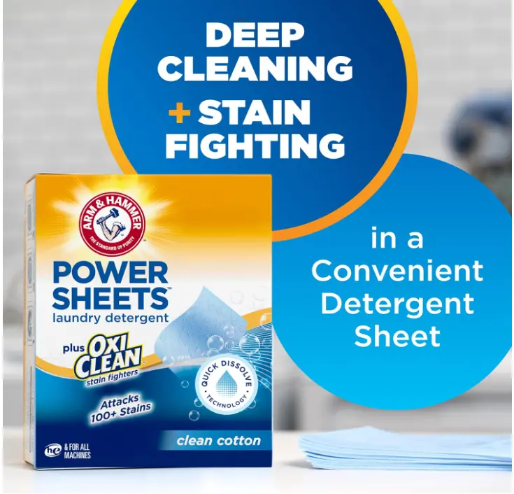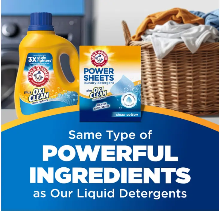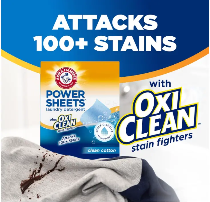 ·POWERFUL DETERGENT SHEETS: ARM & HAMMER Power Sheets Laundry Detergent Plus OxiClean Stain Fighters in a Clean Cotton scent cleans up to 52 small loads when using ½ sheet, or 104 medium loads when used as directed
