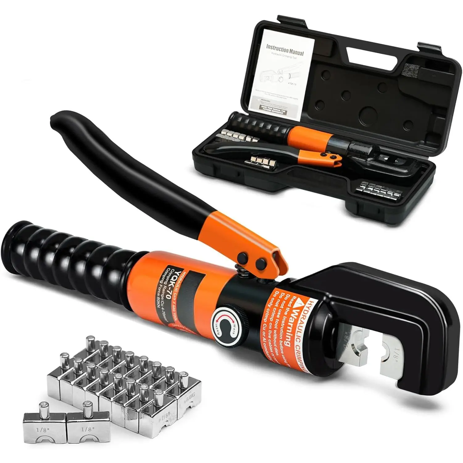 ONE-HANDED OPERATION - Experience convenience and efficiency with this hydraulic crimping tool.The built-in spring mechanism automatically retracts the handle after each crimp, allowing for smooth, one-handed operation.This significantly reduces hand fatigue and speeds up your work compared to traditional two-handed crimpers.10-TON FORCE & VERSATILE USE - This battery cable crimper delivers 10 tons of powerful force with a 0.45-inch stroke, designed to flawlessly crimp a wide range of materials including copper, aluminum, and stainless steel terminals.It expertly handles wire terminals from 12 AWG to 2/0 AWG, making it a versatile tool for various professional and DIY projects.FULL 9-PAIRS HEX DIE SET - Features a full set of 9 pairs of the largest hexagon crimping dies, covering sizes 12, 10, 8, 6, 4, 2, 1/0, 2/0 AWG and including a dedicated 1/8" die for stainless steel wire rope.Each premium die is machined by EDM wire cutting for superior precision and a perfect hex crimp every time, and is clearly marked with both AWG and Metric sizes to eliminate conversion errors.ANTI-SLIP GRIP FOR TOTAL CONTROL - The included gloves are equipped with anti-slip points, while the crimper handles are constructed with a non-slip material.This dual anti-slip design ensures a firm, secure grip and superior control, preventing tool slippage and reducing hand strain for a more stable and comfortable operation.PROFESSIONAL BUILD FOR HEAVY-DUTY USE - Engineered for reliability, this wire crimping tool is built to withstand rigorous daily use. The hardened steel dies guarantee consistent, high-quality crimps over a long lifespan, making it the ideal and durable choice for a wide range of applications including industrial electrical work, automotive repairs, and home DIY projects.
