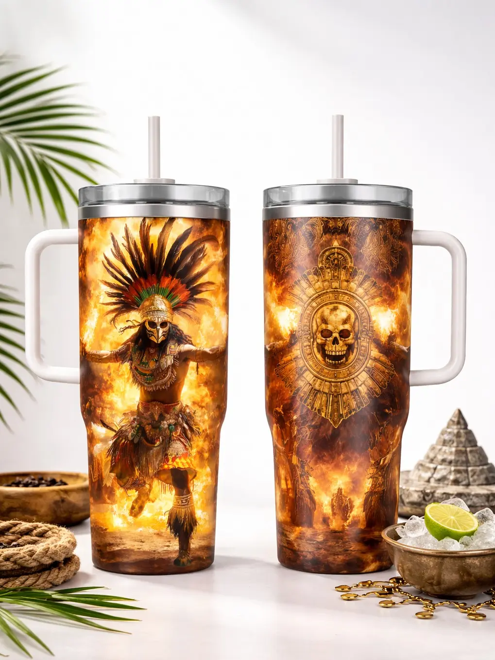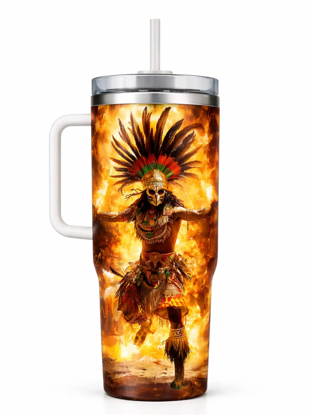 Aztec Warrior 40oz Insulated Tumbler – Unique Gift for History Enthusiasts – Perfect for Adventure Lovers – Vibrant Aztec Warrior & Golden Skull Design – Available for Sale