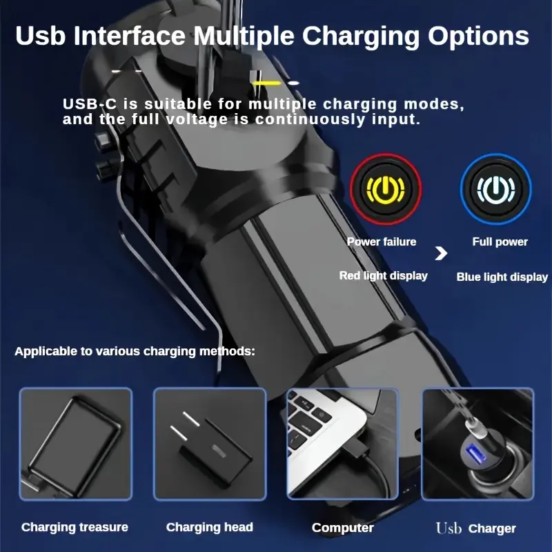 ·CONVENIENT USB C RECHARGEABLE:Design with USB-C charge port which is convenient, durable and easy to charge. The portable flashlight comes with the battery indicator. The battery indicator will help you master battery usage. It will takes 2 hours to get a full charge.