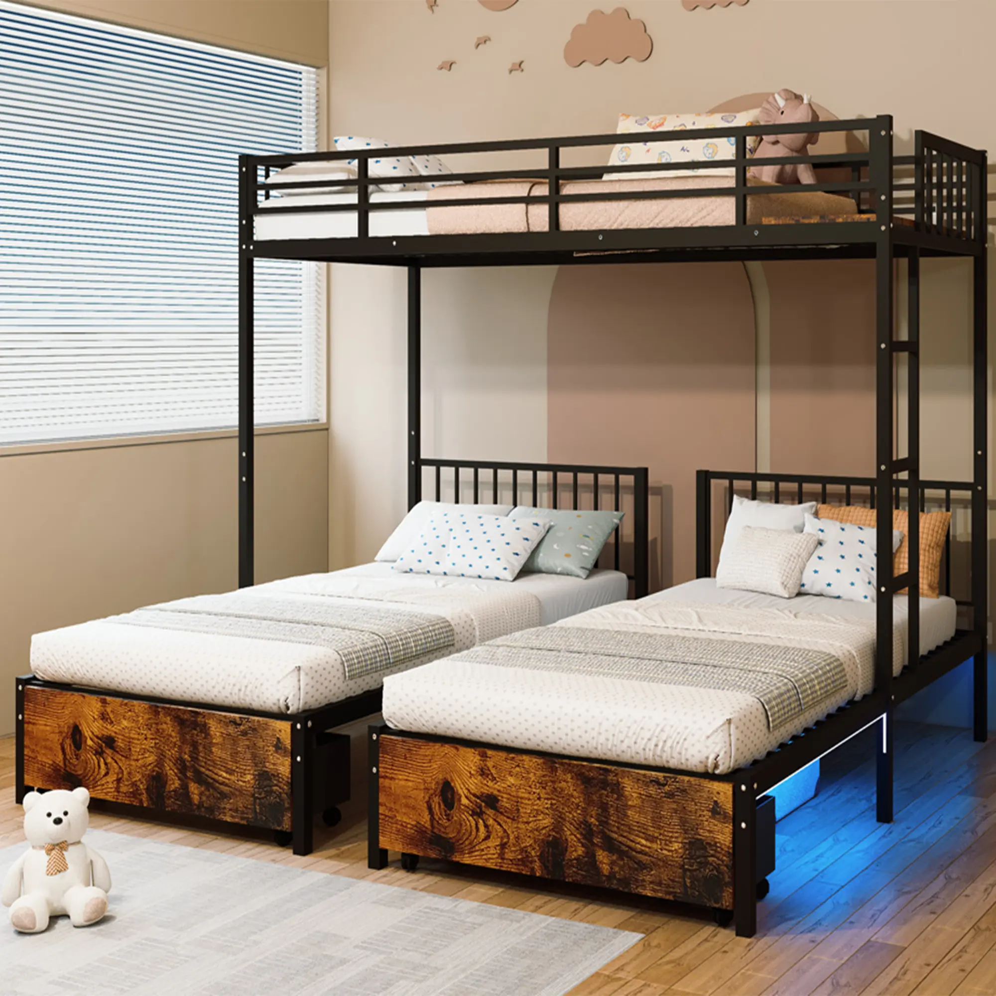 ·Metal Triple Bunk Bed with Charging Station and LED Lights: Keep essential devices powered up right from bed! This innovative design features a convenient built-in power strip within easy reach, including 2 AC outlets, 1 USB port, and 1 Type-C port. Create a warm, charming night atmosphere! The vibrant RGB LED lights feature music mode, timing functions and adjustable brightness, easily managed via an app or remote control.