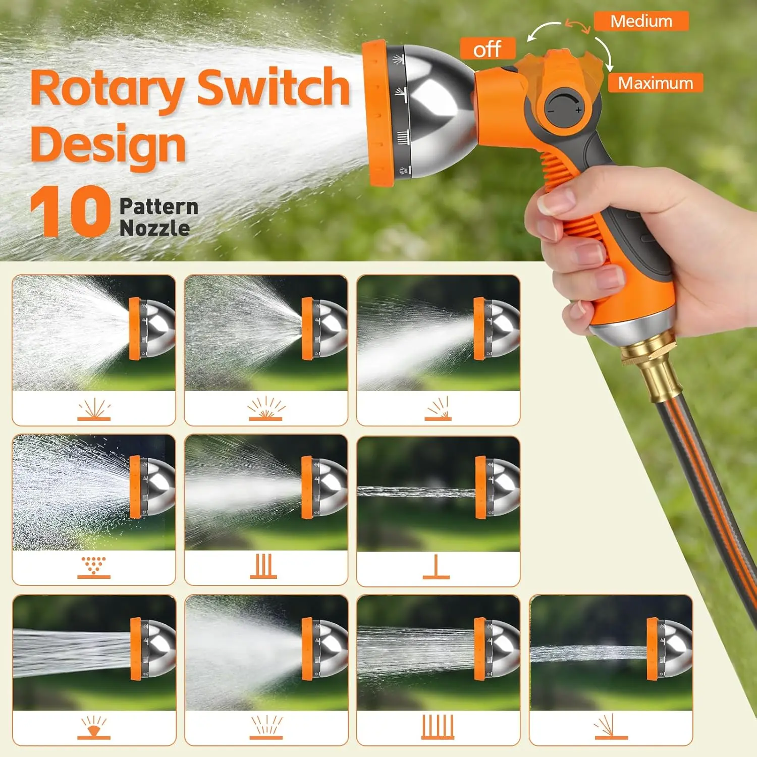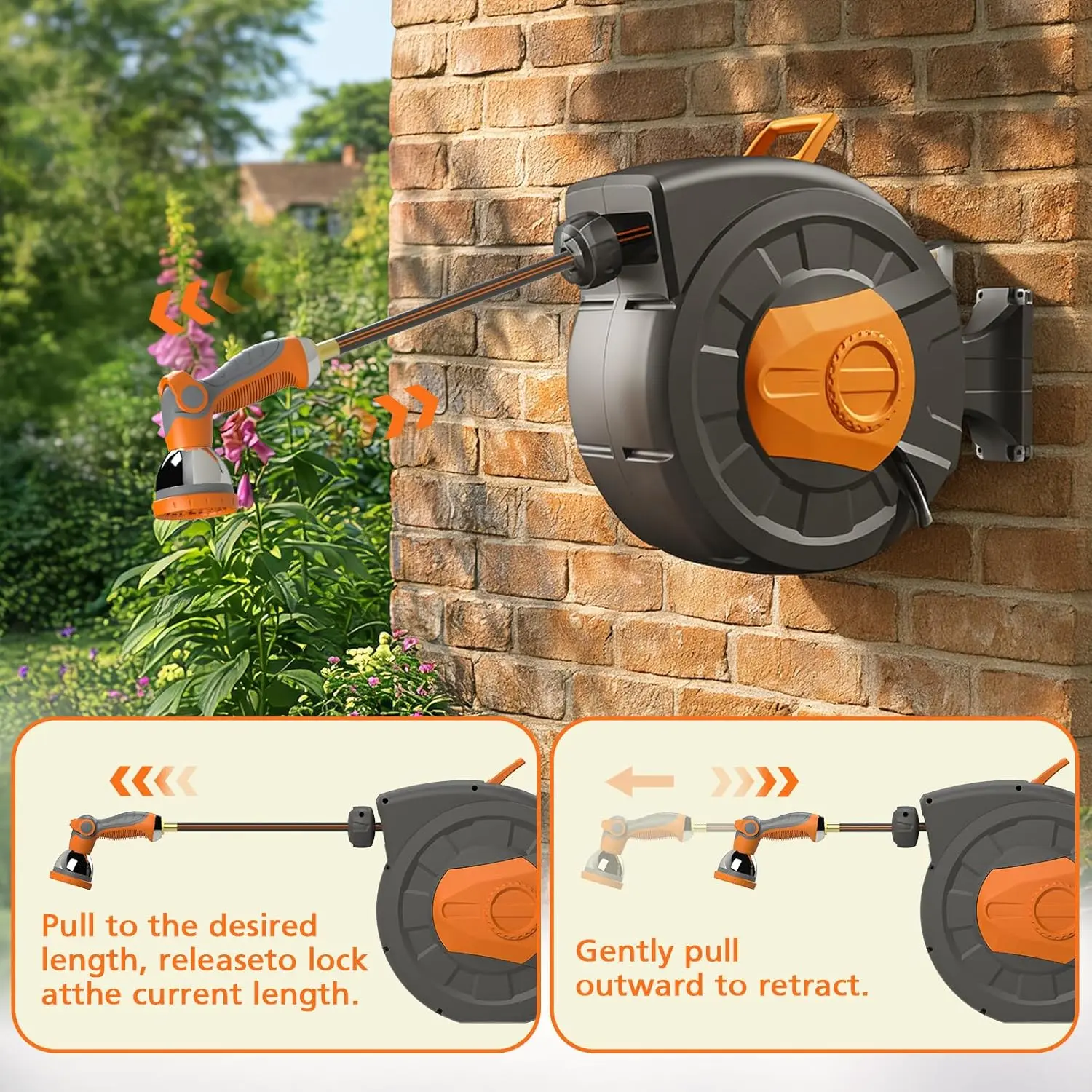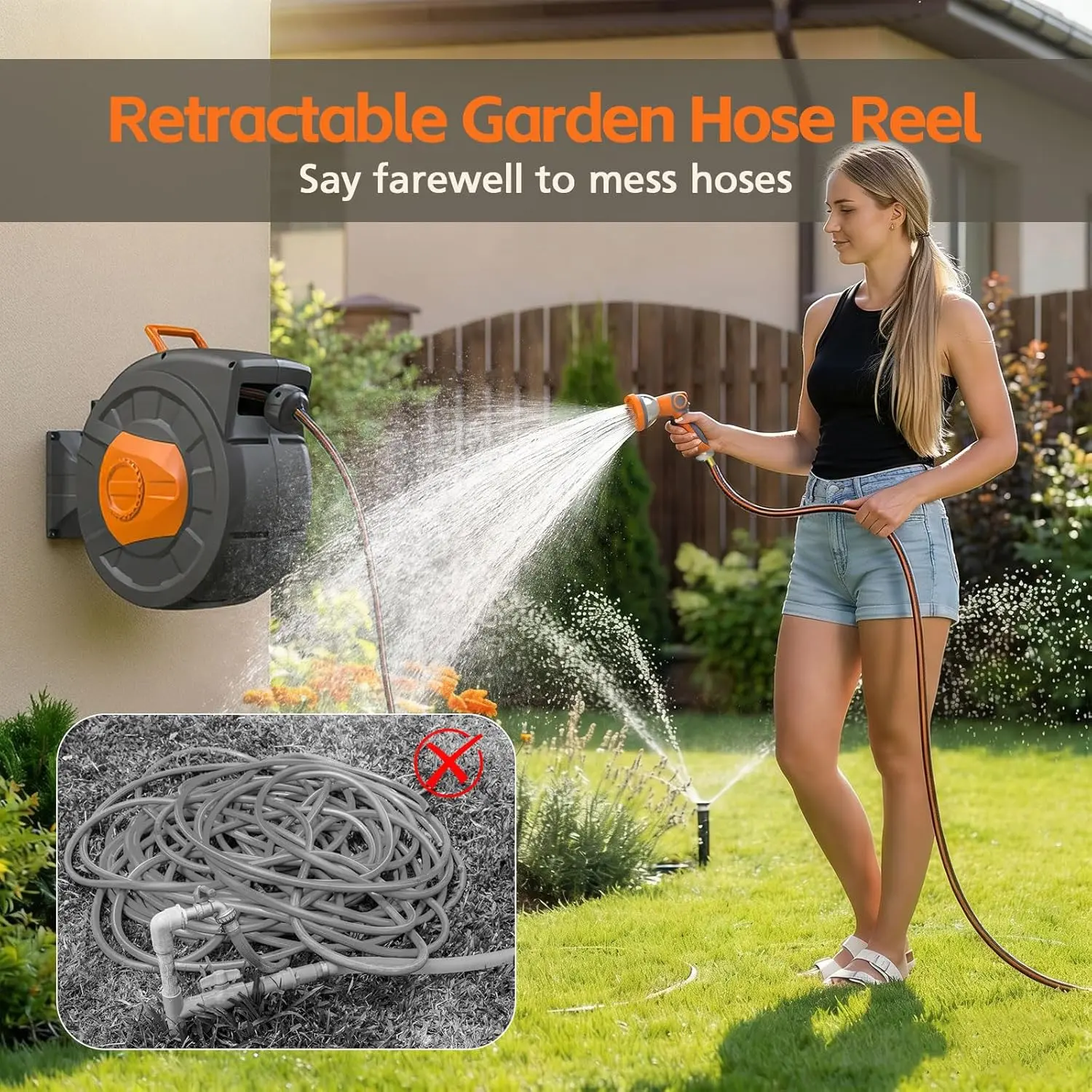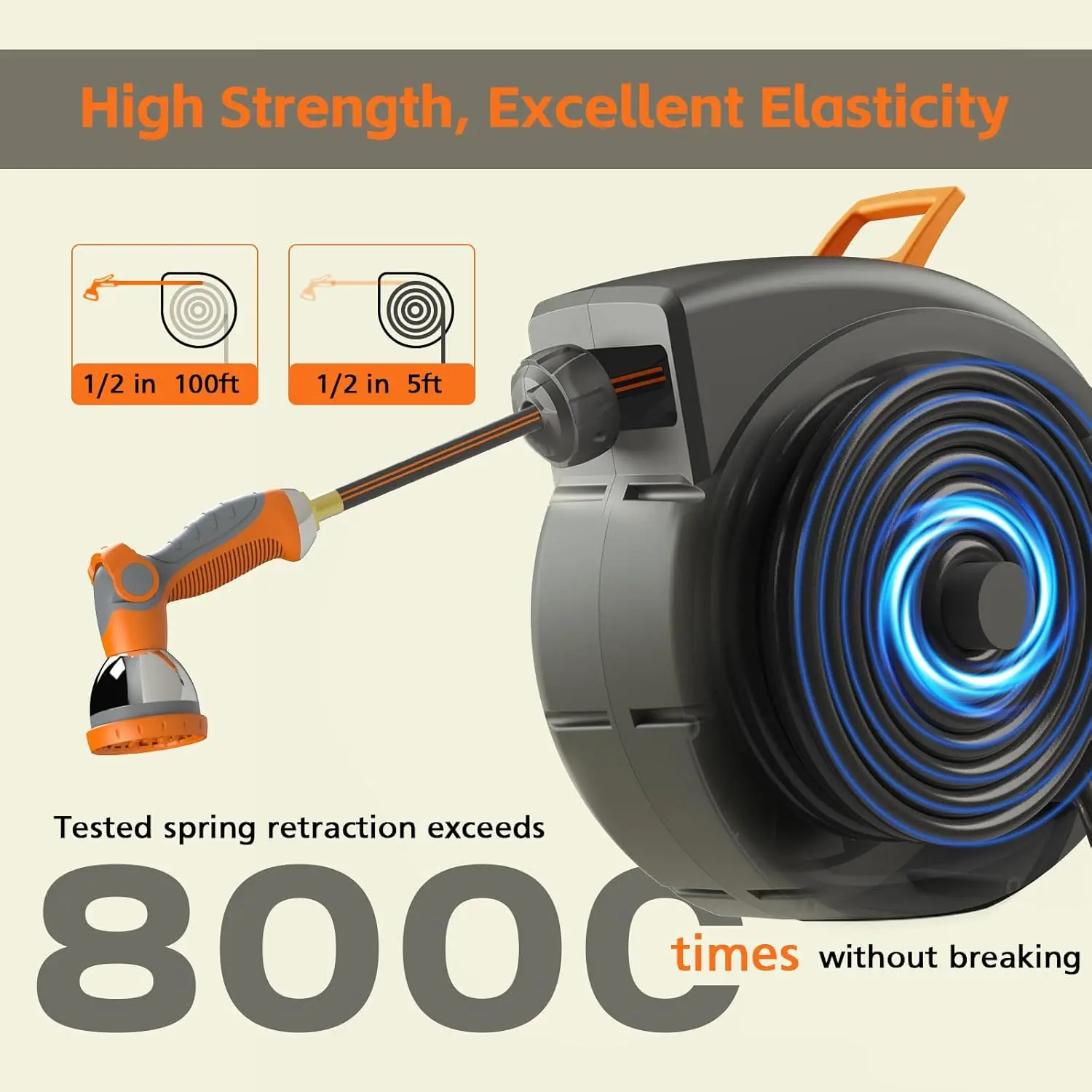 Retractable Garden Hose Reel 100 FT, 1/2" Heavy Duty Garden Hose 435 PSI Burst Pressure, Wall Mounted Water Hose Reel with 10-Pattern Nozzle, 180 ° Swivel, Slow Auto Rewind & Any Length Lock