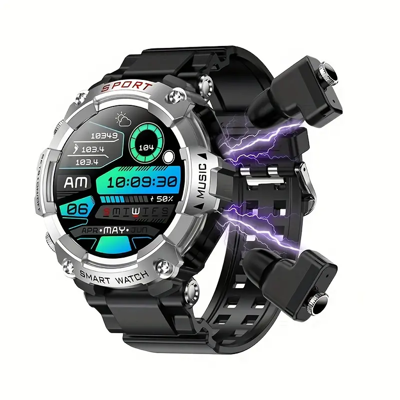 BUILT-IN EARBUDS: Comes with ergonomic in-ear wireless earbuds, featuring bi-directional noise cancellation and HIFI 9D sound quality for clearer calls, with a watch compartment for convenient charging and on-the-go use.