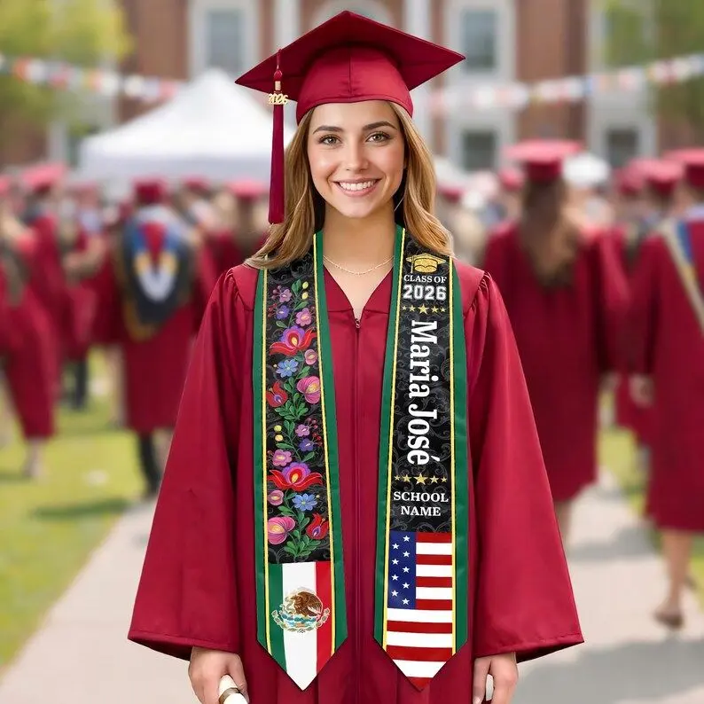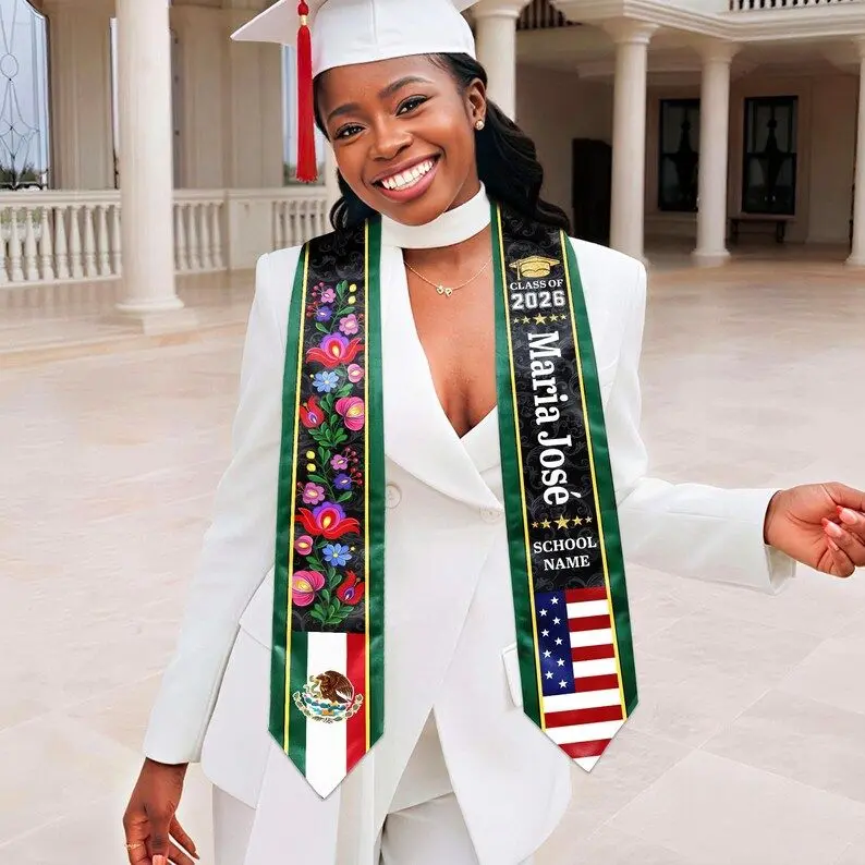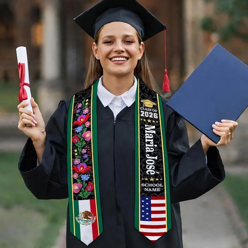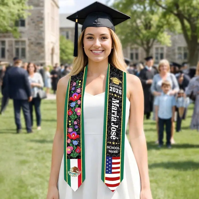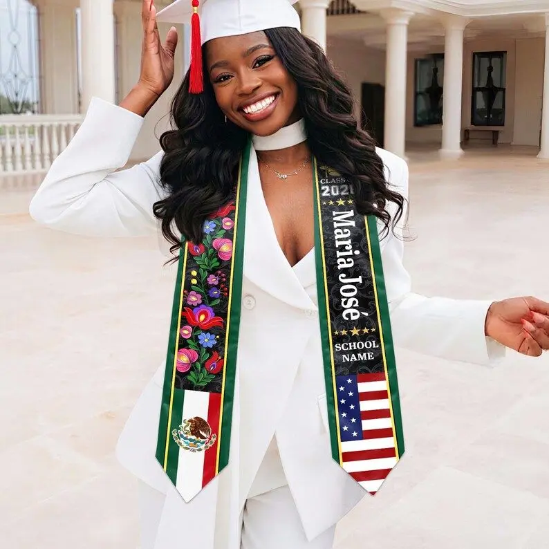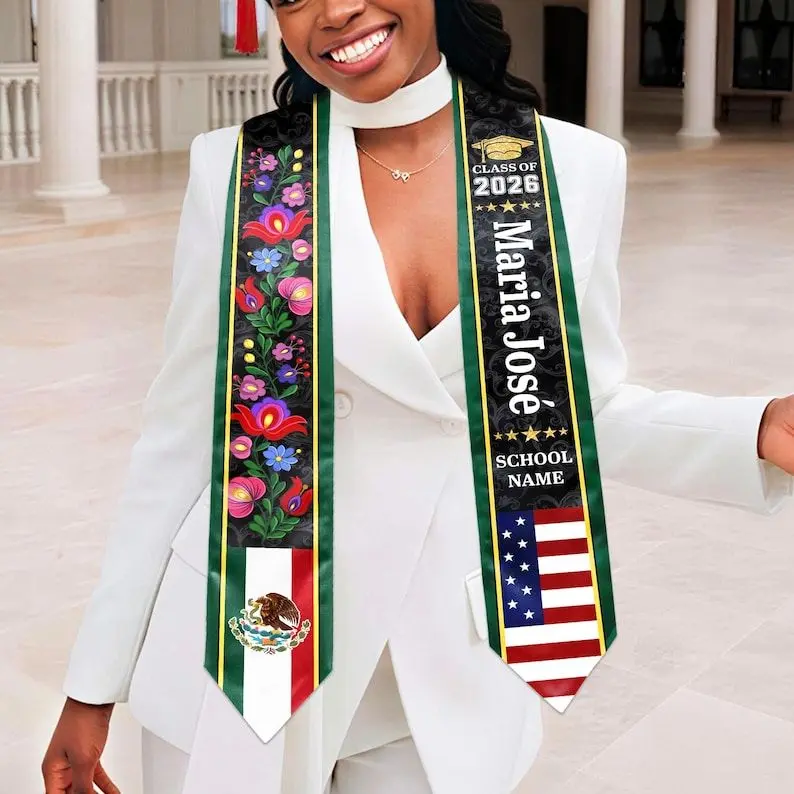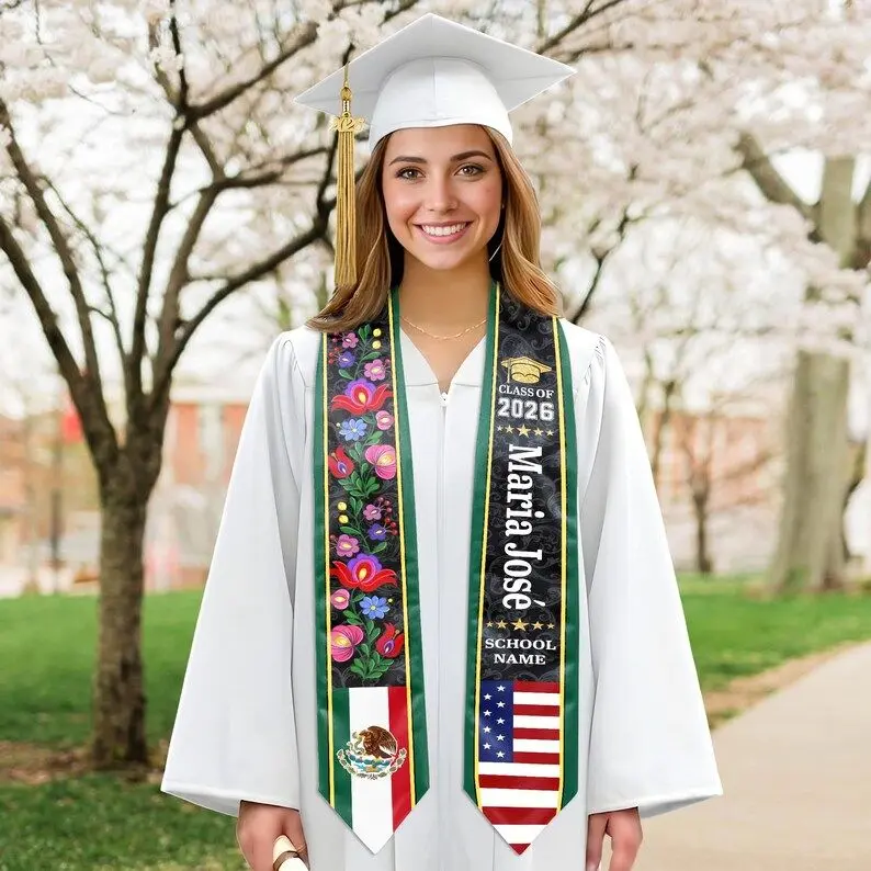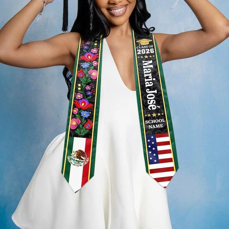 Custom Floral Mexican Graduation Stole, 2 Flag Mexican American Graduation Sash, Mexican Student Stole 2026, High School College Graduation Graduation Stole