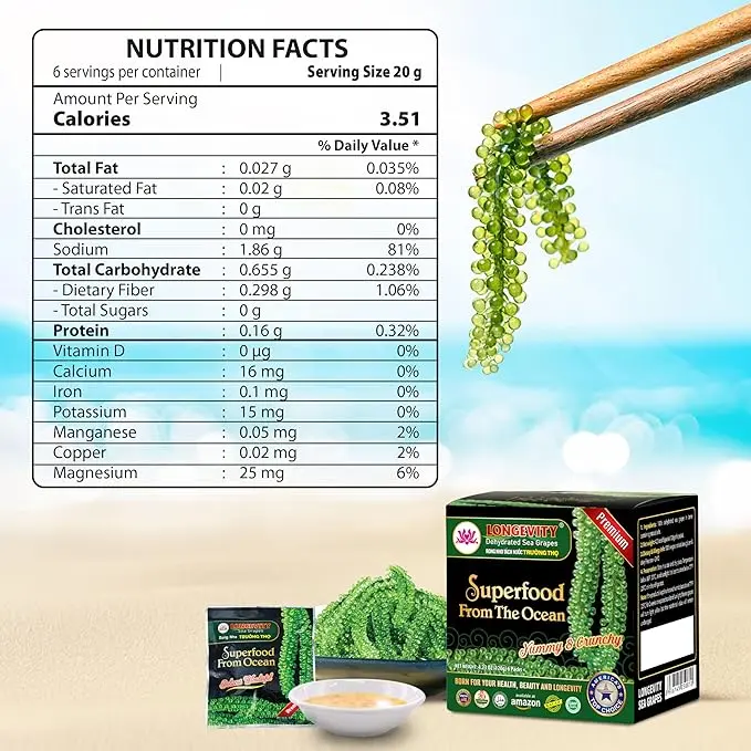 ·THE GOODNESS BEYOND TASTE: Your Longevity Sea Grapes purchase extends far beyond flavor. Contribute to a brighter future by positively impacting the marine environment, creating job opportunities, and supporting social development in impoverished coastal regions of Vietnam. Experience the taste of compassion with every delightful bite!