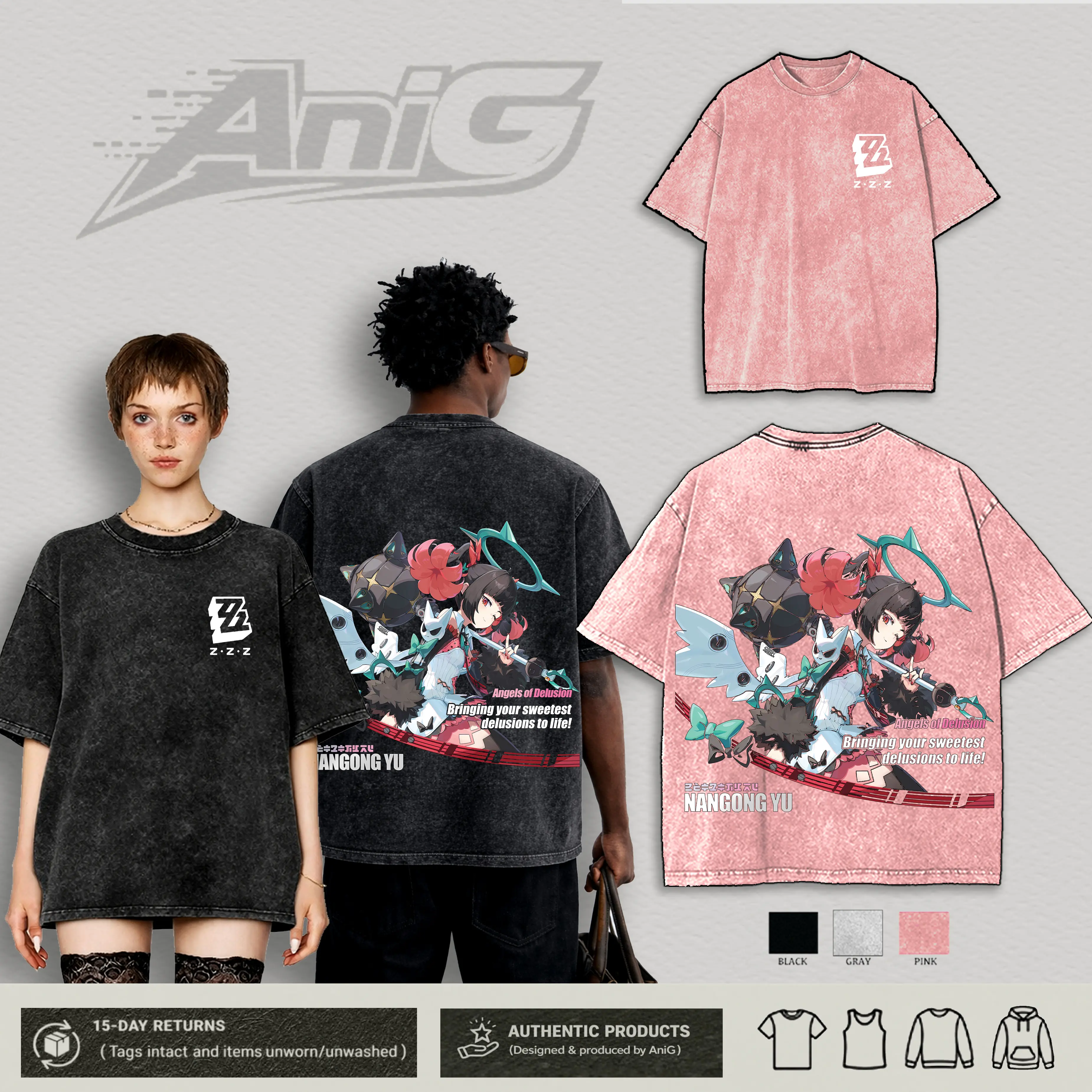 5. VINTAGE NANGONG YU Angels Of Delusion Limited Design Oversized Graphic Tee Double Sided Print Washed T-Shirt Hoodie Sweatshirt & Tank Top Game, Crewneck, Casual, Heavyweight Cotton, Anime Merch, ZZZ Top Streetwear Menswear Zenless Zone Zero