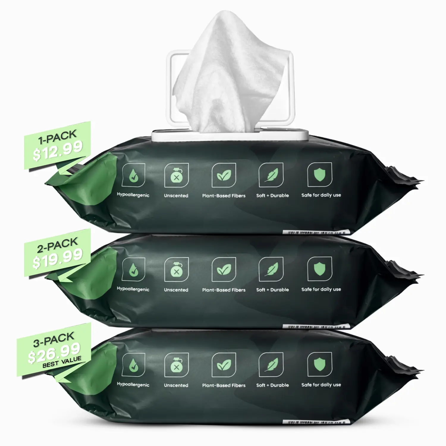 80 thick wipes per pack — enough for weeks of daily walks Won't tear or fall apart mid-wipe Hypoallergenic & unscented — safe for sensitive skin and allergies Safe for paws, coat, face & sensitive areas Plant-based fibers — no harsh chemicals Resealable flip-top lid keeps wipes fresh between uses Safe for daily use — no buildup, no irritation