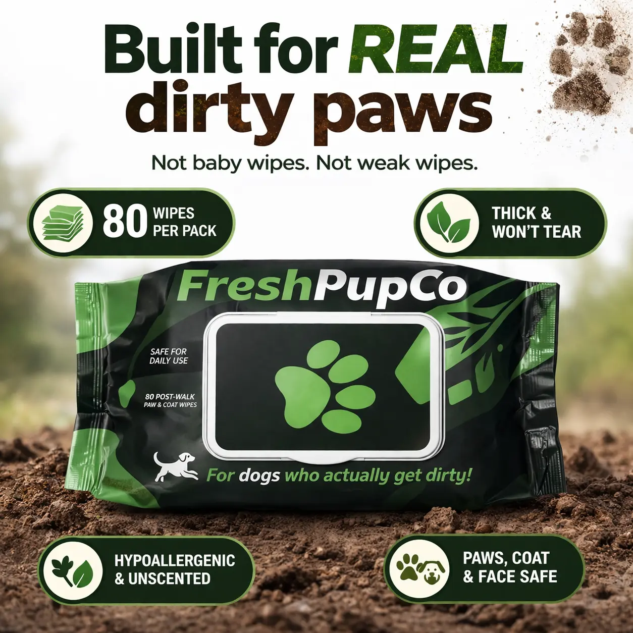 Most dog wipes fall apart the second they hit a muddy paw. FreshPupCo wipes are built different — thick, durable, and strong enough to handle real dirt after real walks.