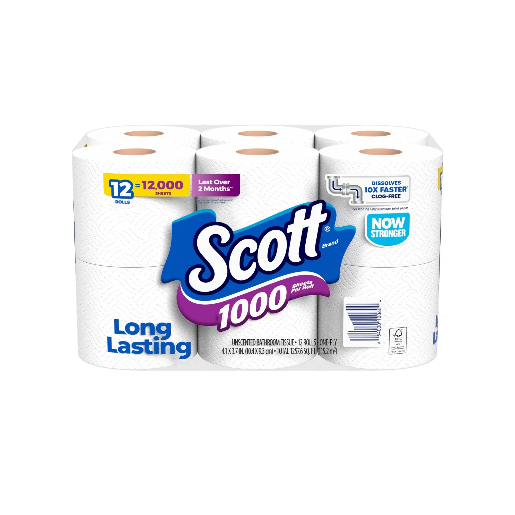 ·12 rolls, 1,000 sheets per roll, of Scott 1,000 Toilet Paper—packaging may vary from images shown.
